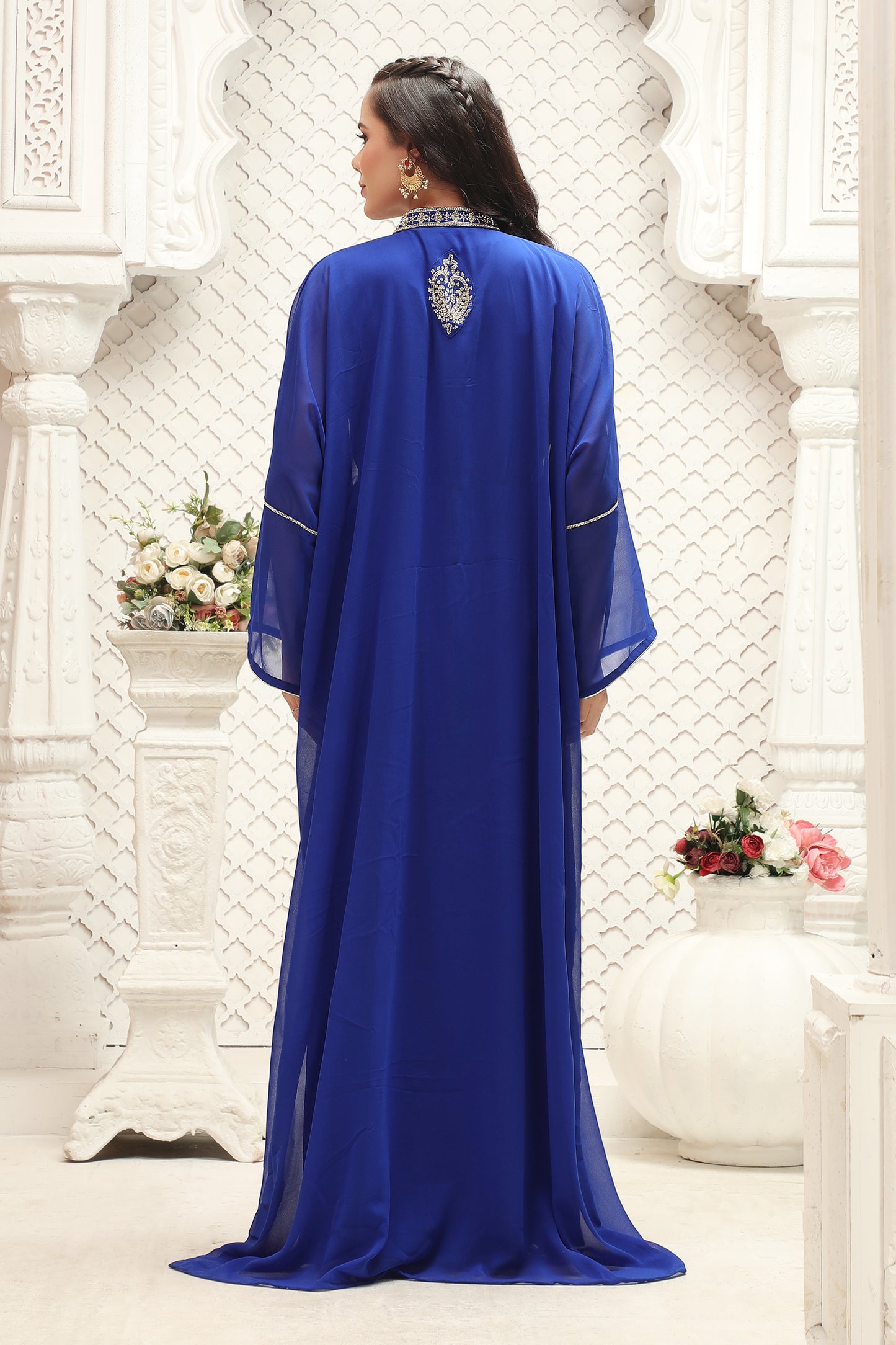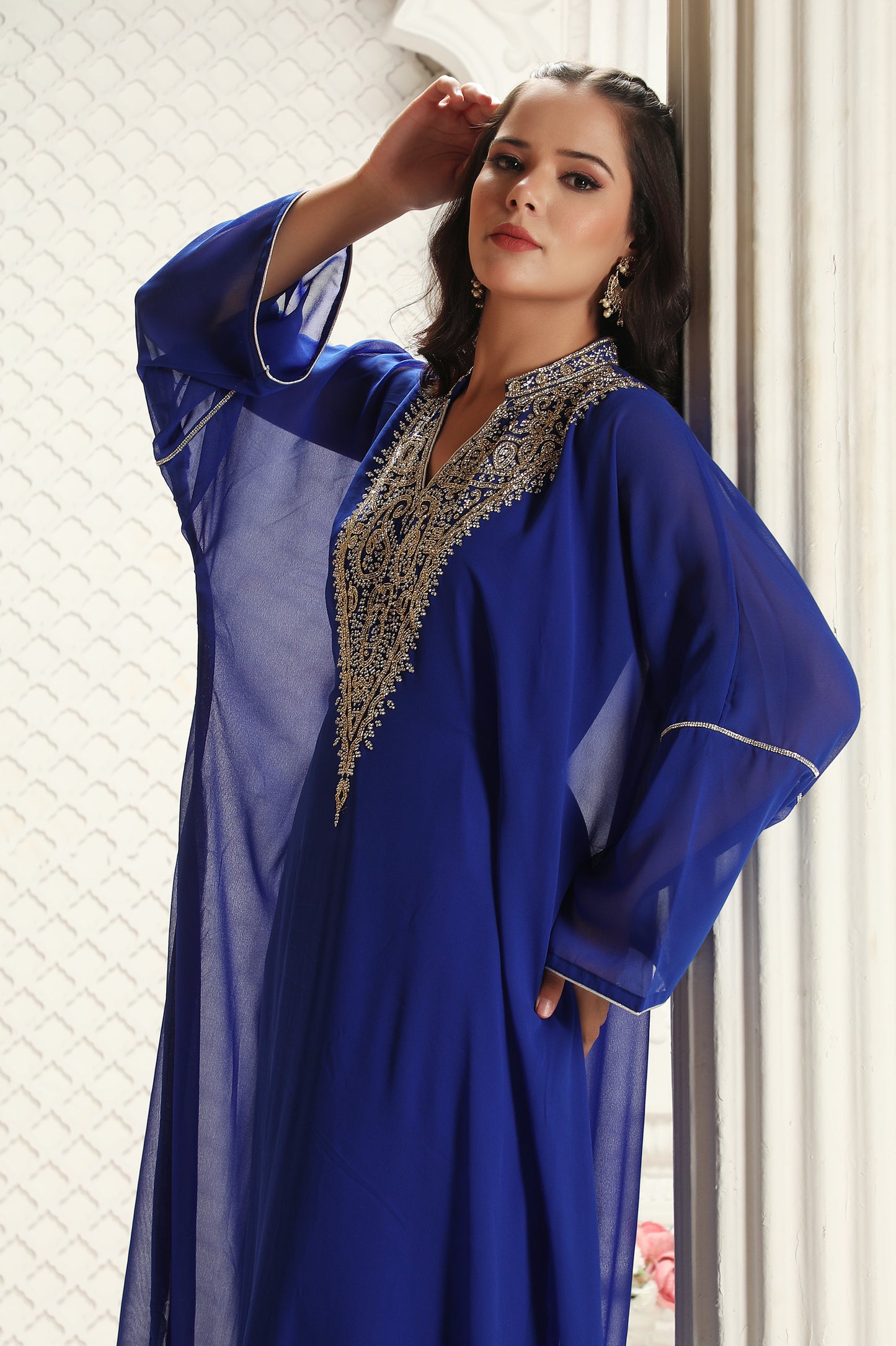 Royal Blue Embroidered Kaftan Gown with Sheer Flowing Sleeves |