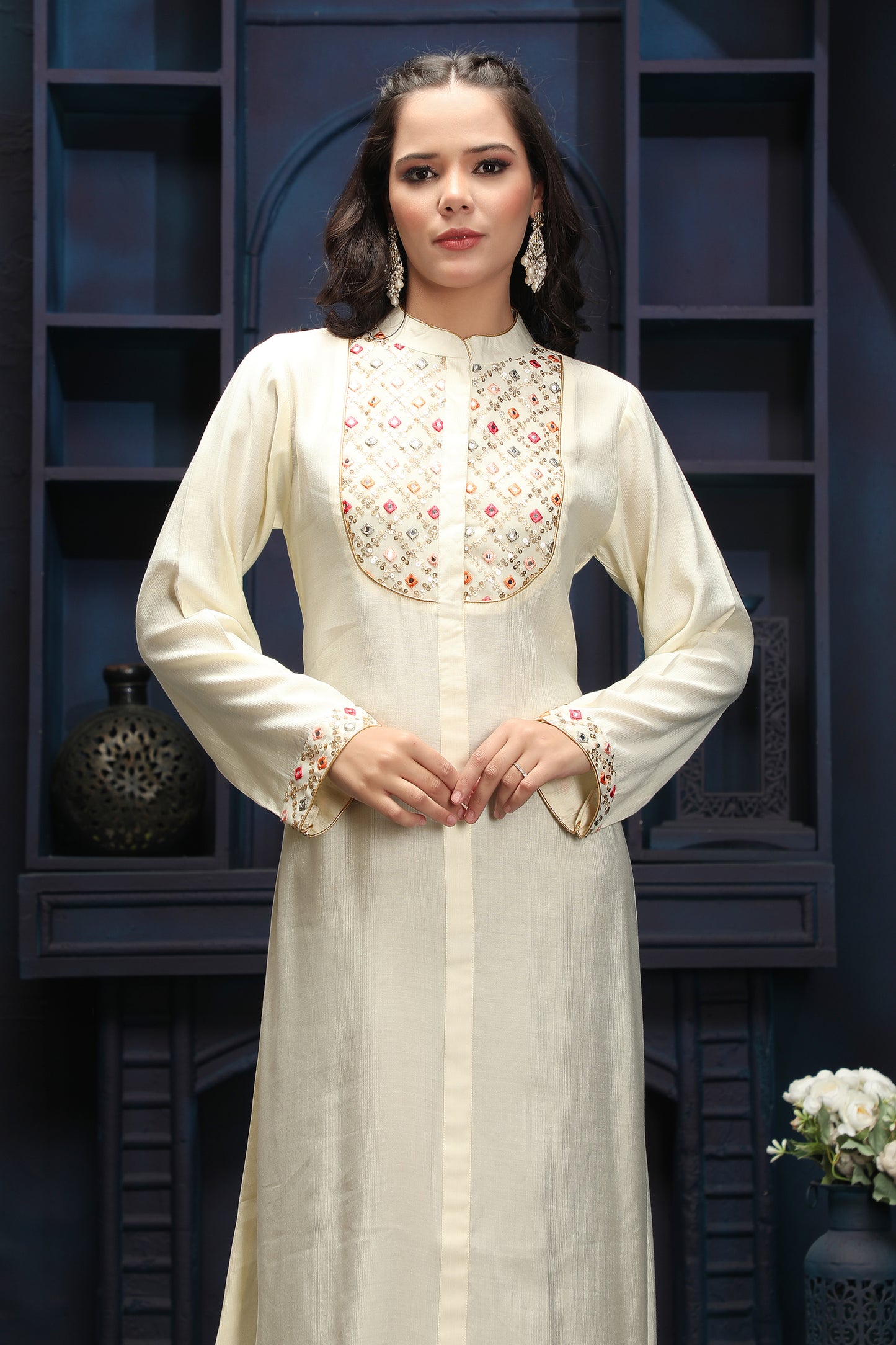 Designer Jalabiya in Ivory with Embroidered Front Panel By Maxim Creation |