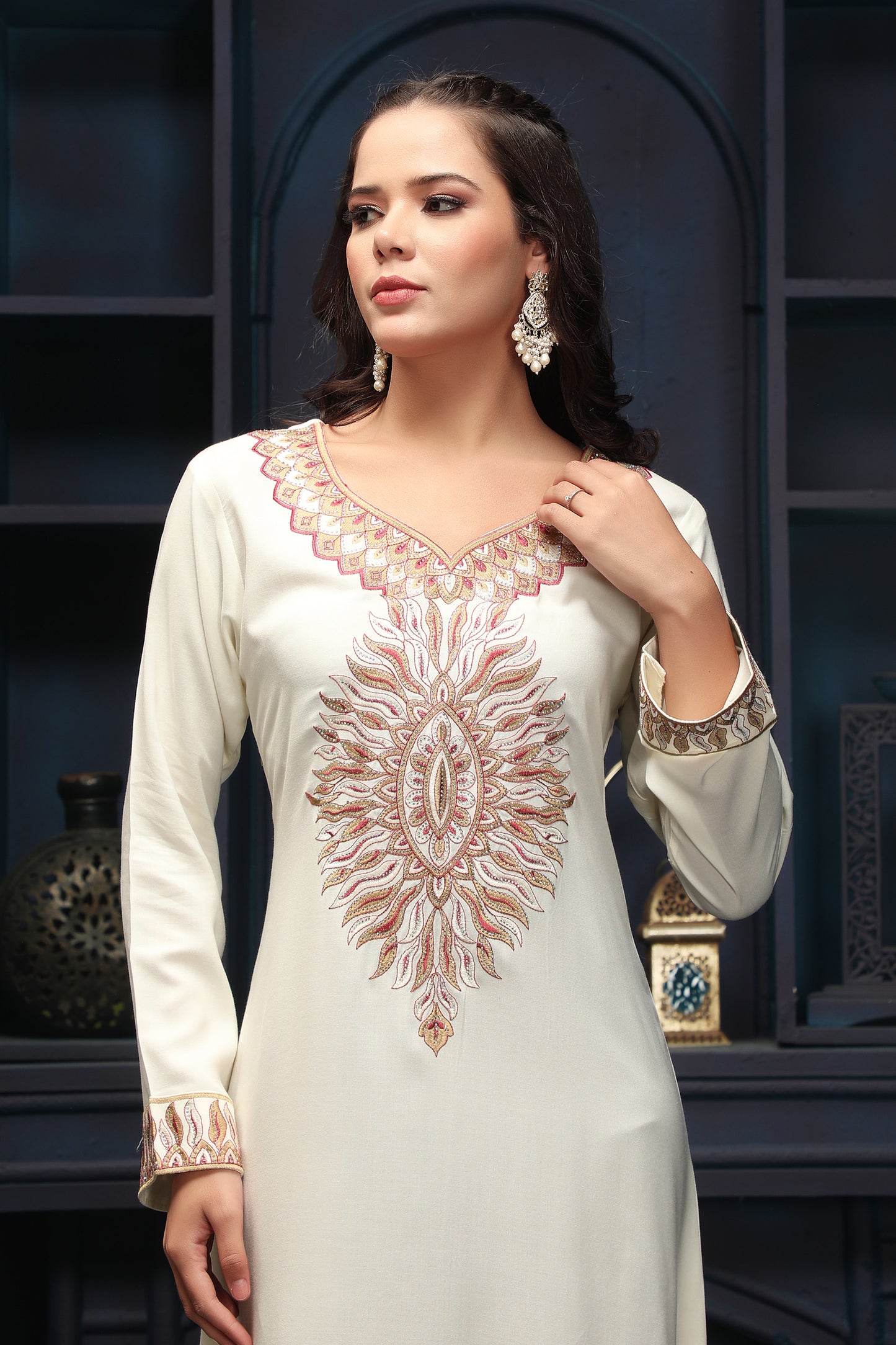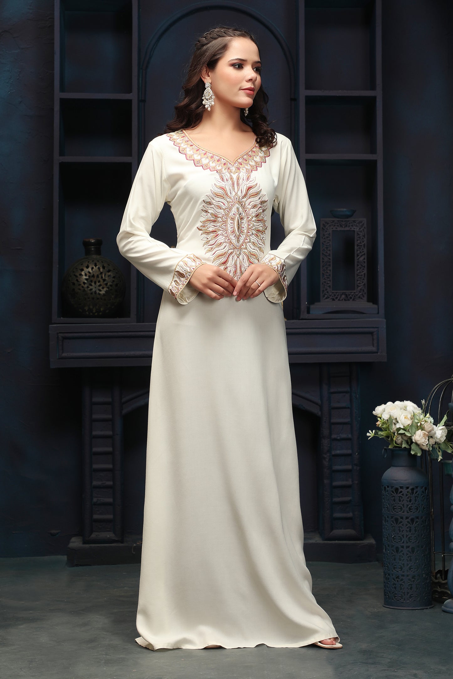 Designer Jalabiya in Ivory with Multicolor Embroidery - Maxim Creation