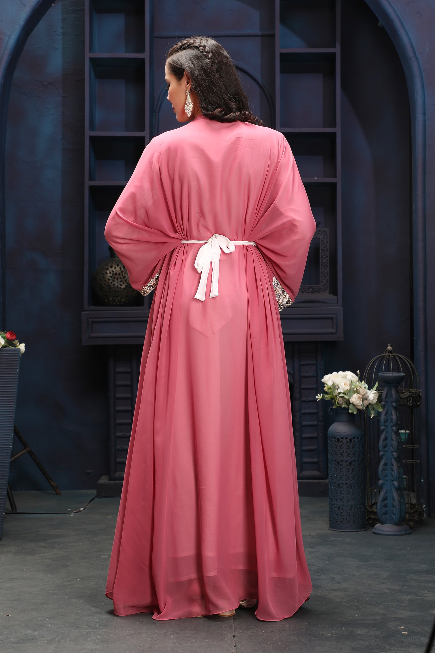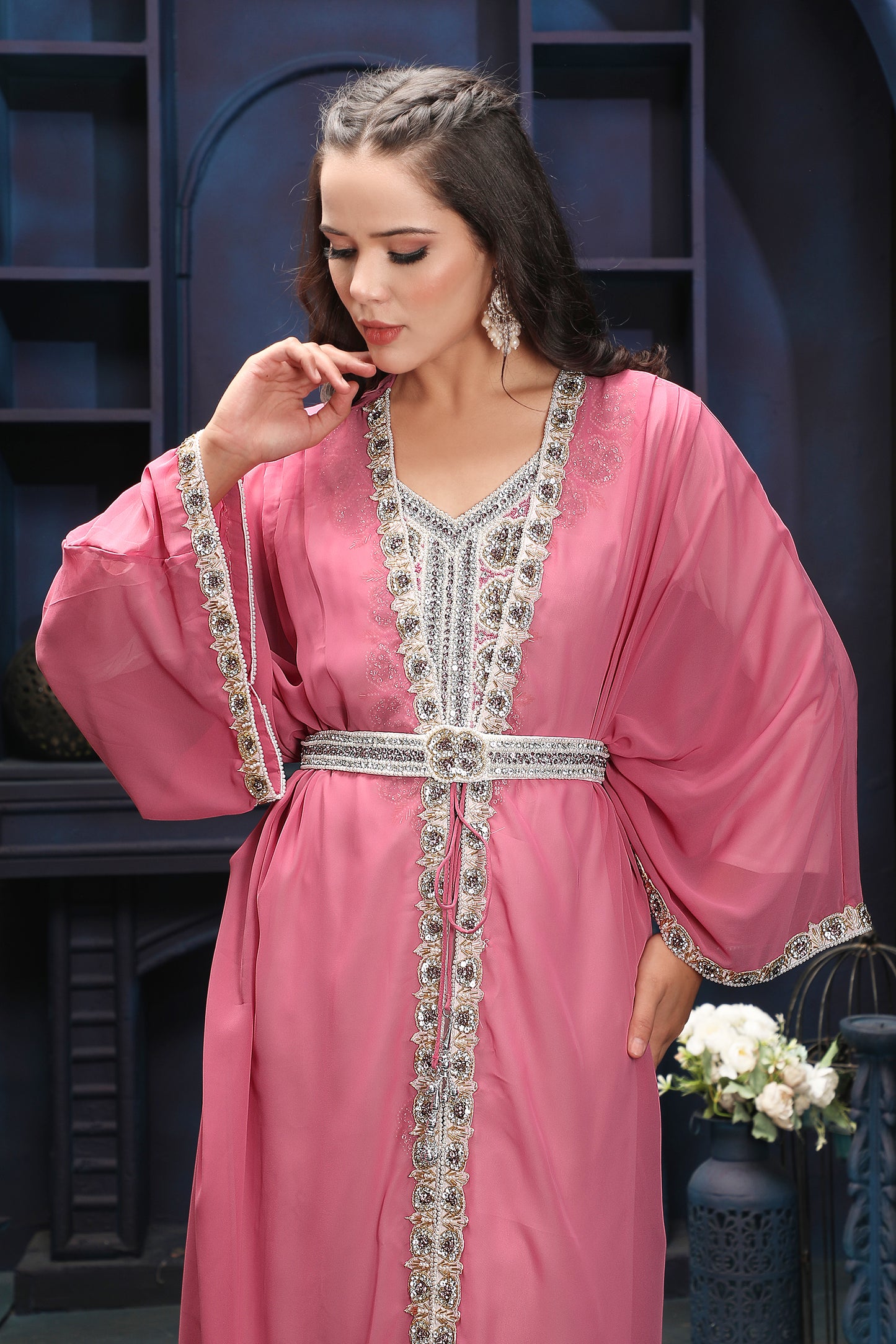 Premium Pink Floor-Length Kaftan with Statement Embroidery |
