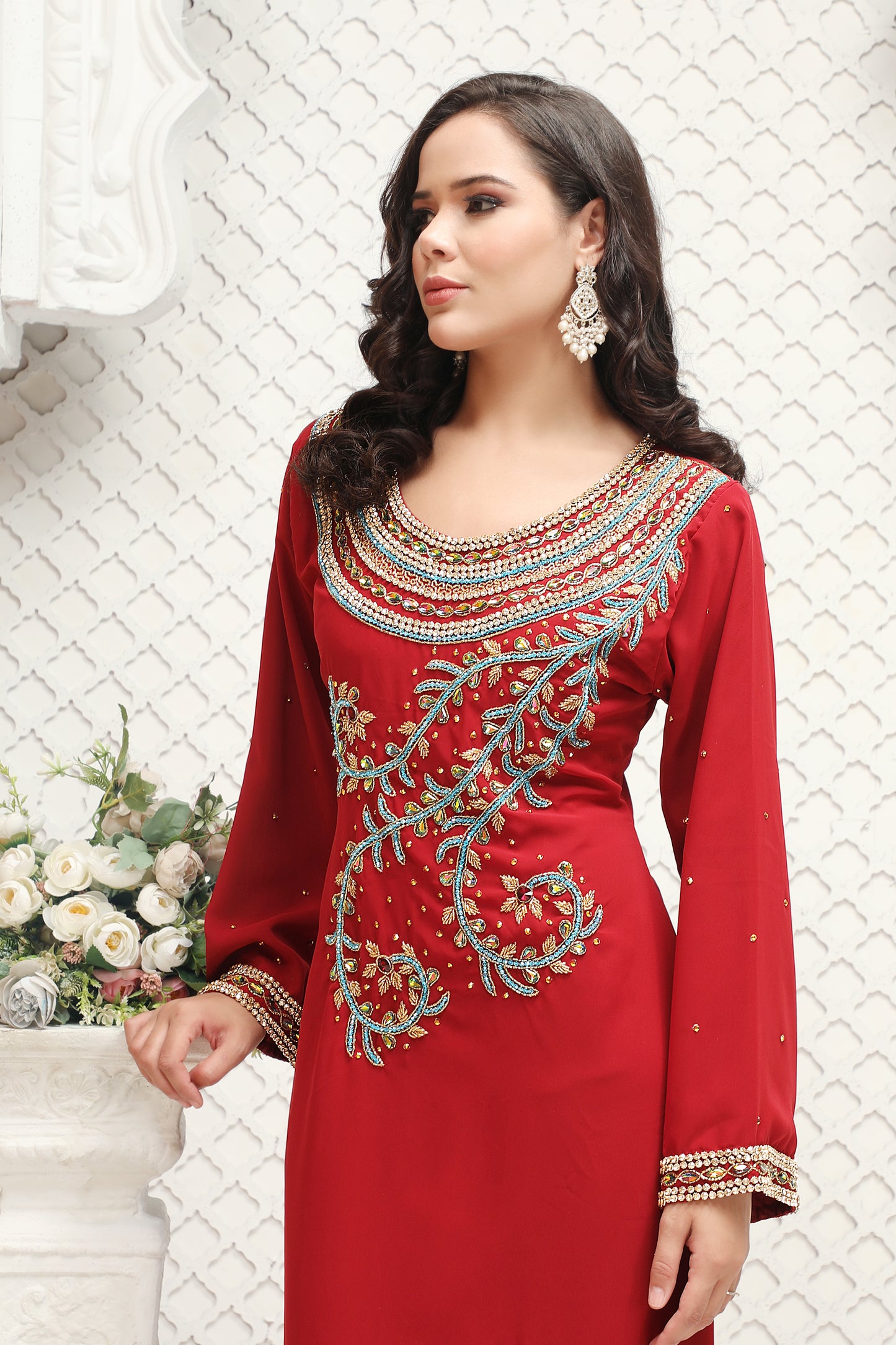 Red Embroidered Kaftan Gown with Intricate Handwork Detailing |