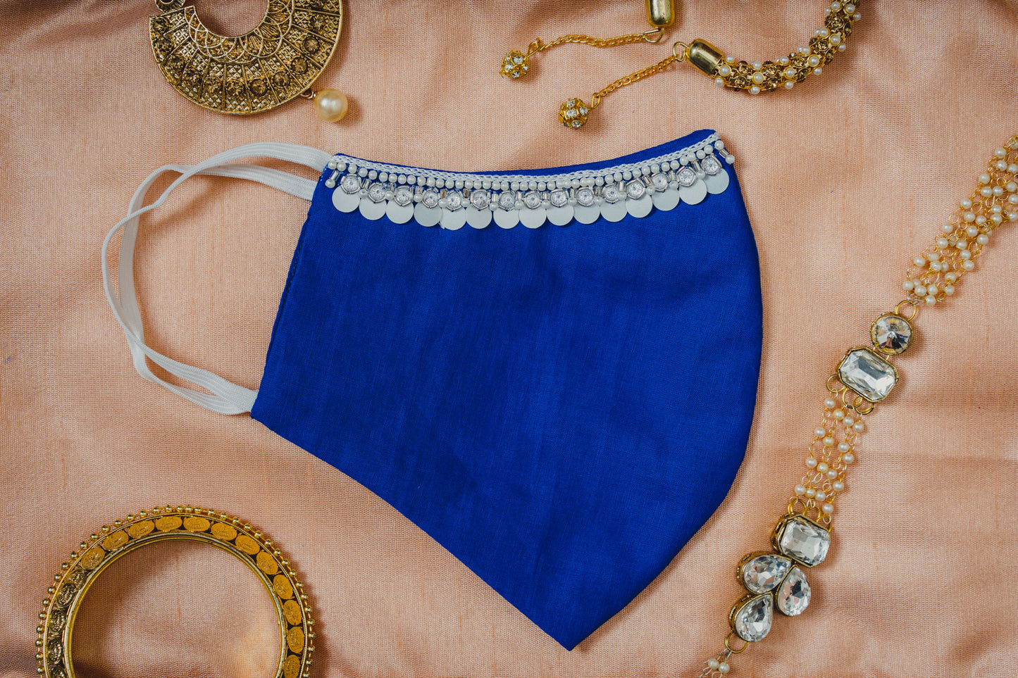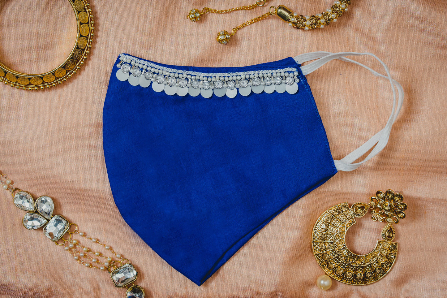 This is a Royal Blue coloured Face Mask with Moonstone Shaped Sequin Embroidery. It can be used for your Special Occasion and can also be gifted to your loved ones. Maxim Creation keeps safety as a first priority with unique and fashionably hand crafted designs. This timeless and luxurious piece face mask is perfect for family functions and parties or wedding occasion and casual wear. |