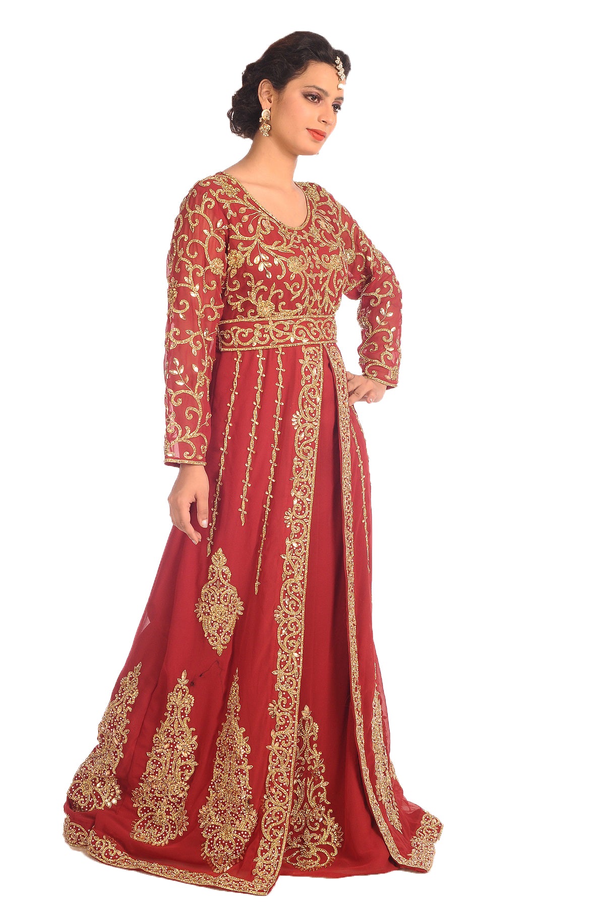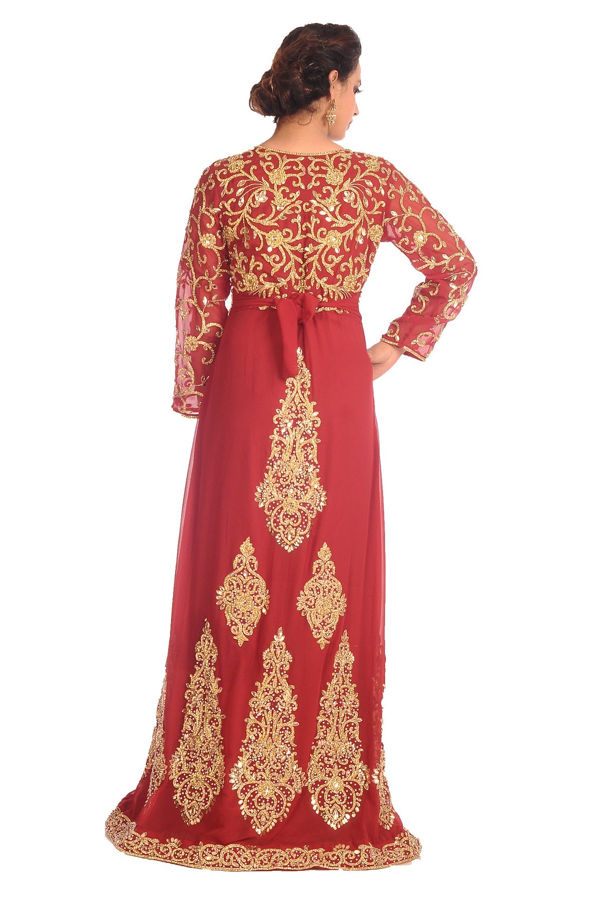 This mix colour beads and sequins hand embroidery will glitter up your occasion. This georgette fabric kaftan dress is 1 piece set & full sleeve dress + 1 free belt (this dress is lined from the inside). |