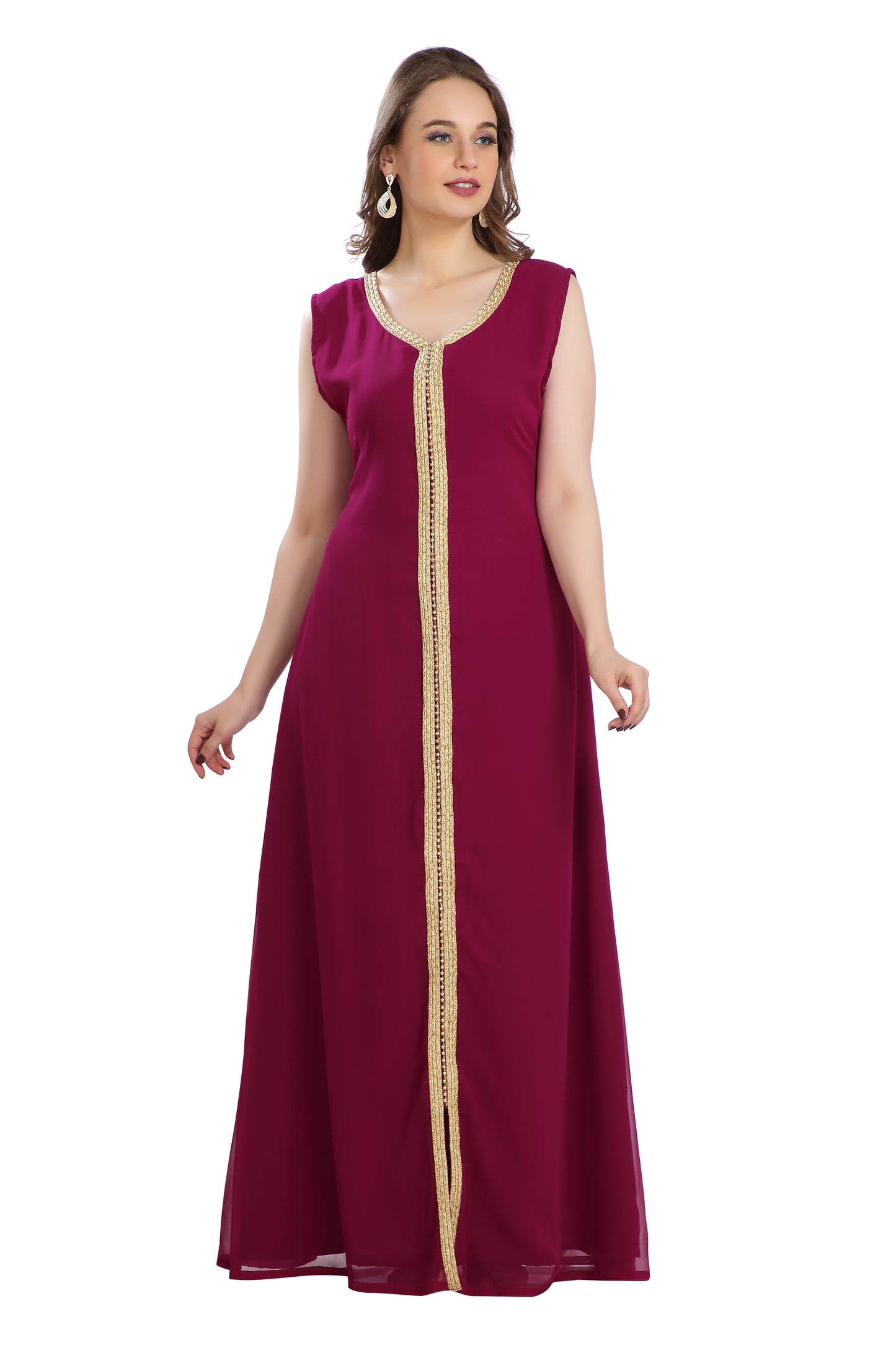 Add an element of class to your ordinary ensemble with our stunning stone studded wedding gown. This golden colour beads and sequins ari work machine embroidery with hand touch will glitter up your occasion. This net fabric kaftan dress is 3 piece set (with belt) & full sleeve dress. (This dress is lined from the inside). |