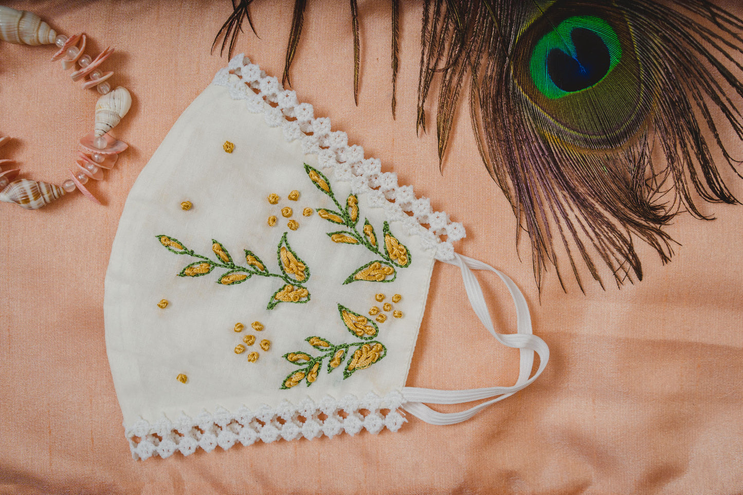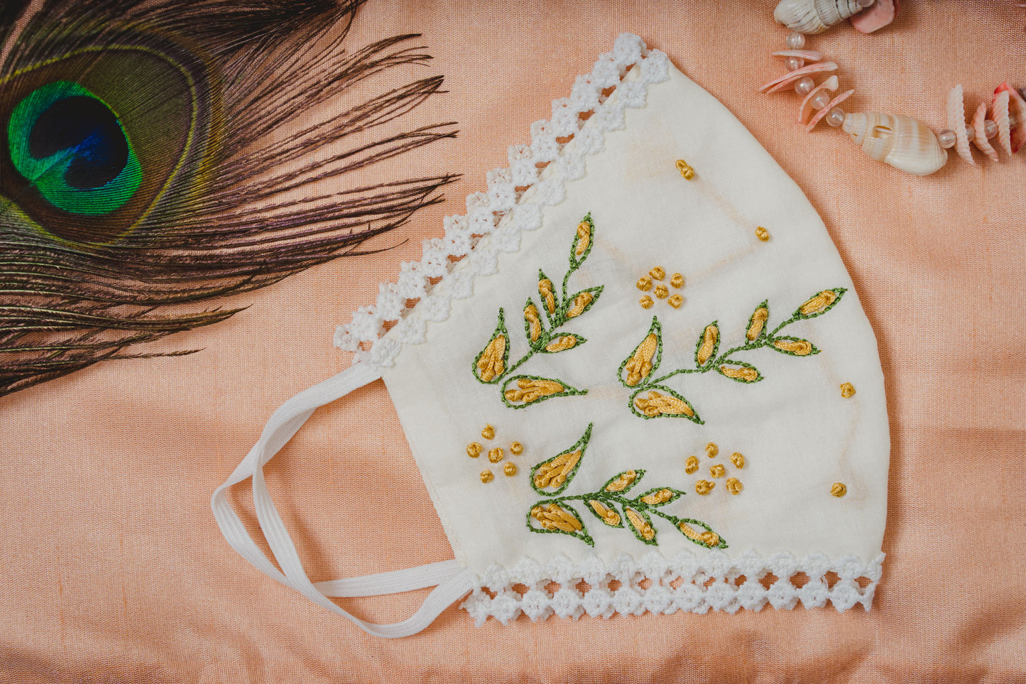 Cream Coloured Cotton Lace Face Mask with Floral Thread Embroidery - Maxim Creation