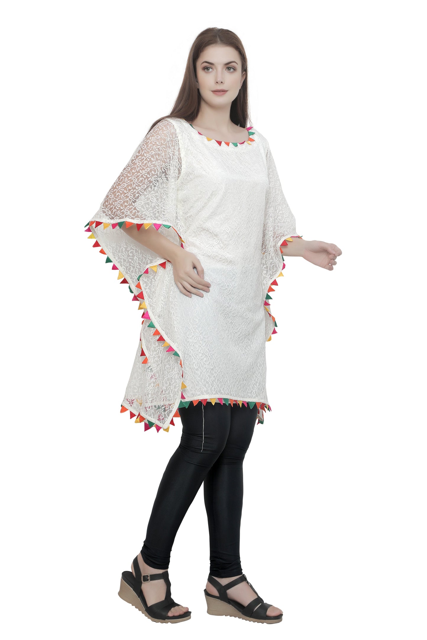 Cream Floral Net Beach Caftan with Colorful Trim |