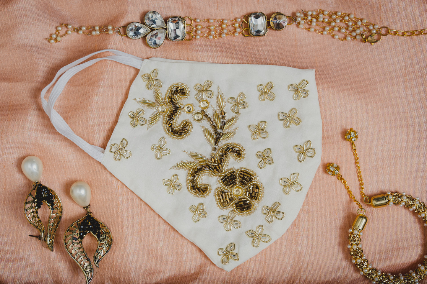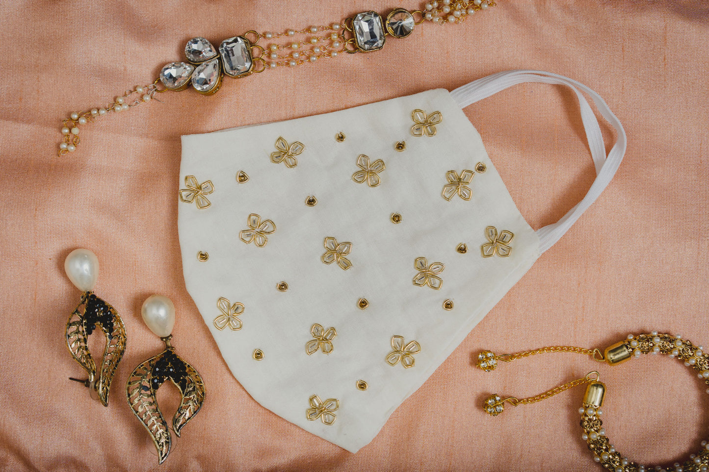 This is a cream coloured embroidery face mask with golden flower embellishments. Hand–Made by our Designers and Artisans. Maxim Creation keeps safety as a first priority with unique and fashionably hand crafted designs. This timeless and luxurious piece face mask is perfect for family functions and parties or wedding occasion and casual wear. |
