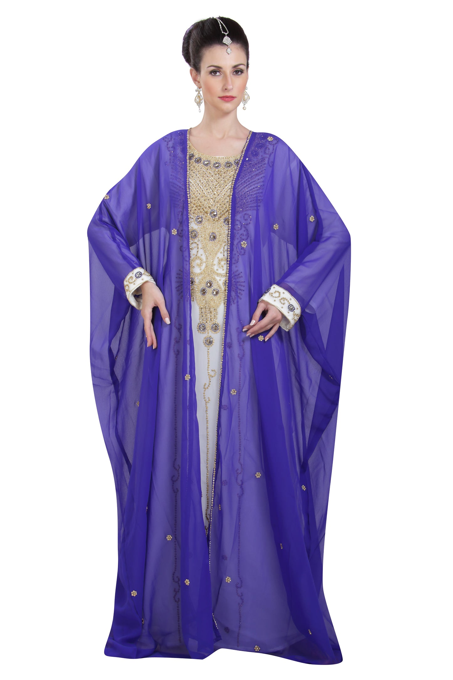 Keep the party a hot and memorable one with this gorgeous and striking elegant farasha kaftan georgette dress! Wear this graceful attire to stick the moment forever in your fan’s mind as it is the best-for-all-occasion dress you have been in search of! With the almighty mixture of colorful beads and sequins, this hand embroidery dress will offer you a stunning look throughout the night party. This blue jacket and cream inner colored georgette kaftan is an innovative maxim creation’s collection. Get a belt absolutely free with this dress to enrich your beauty. |