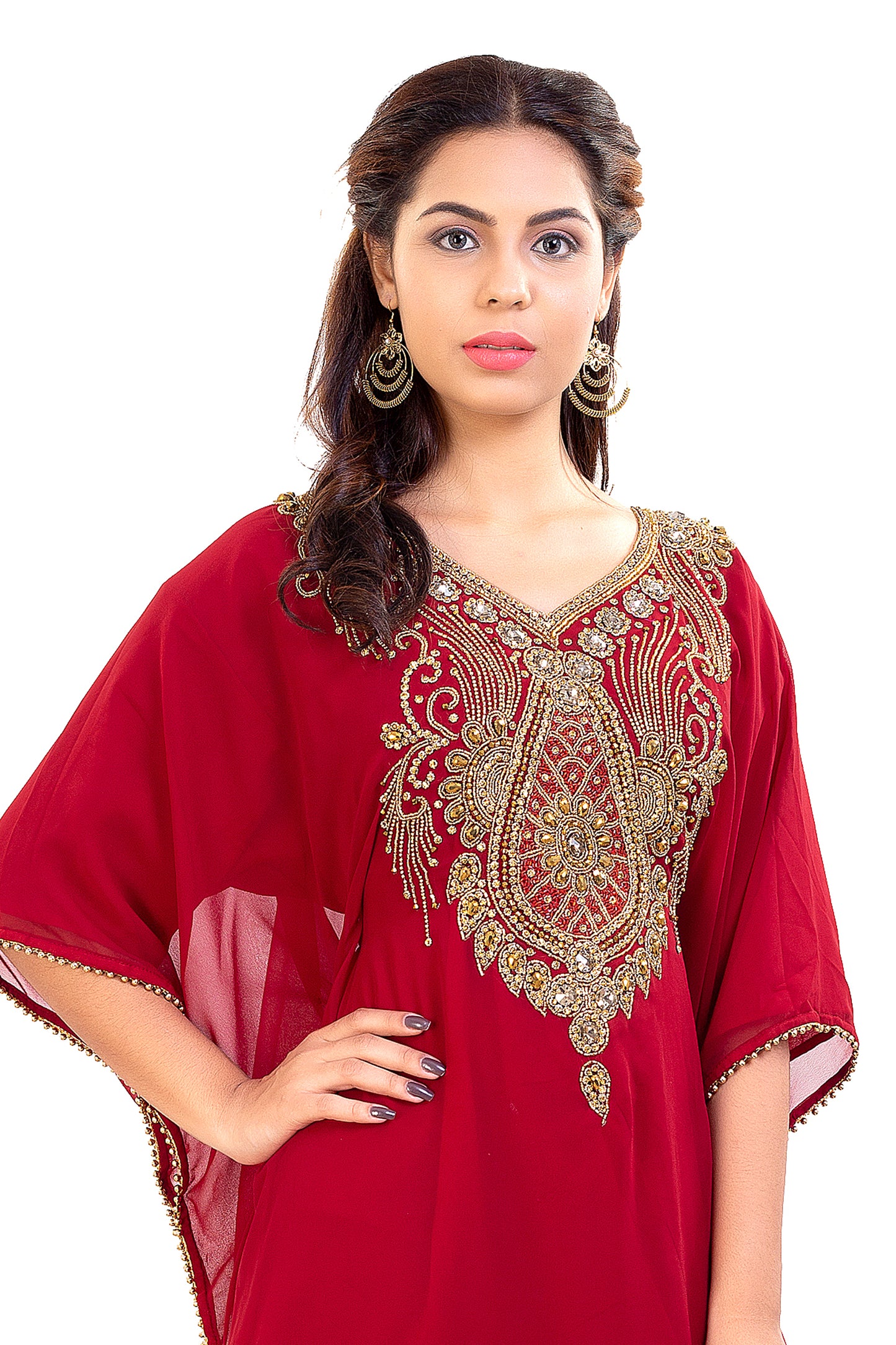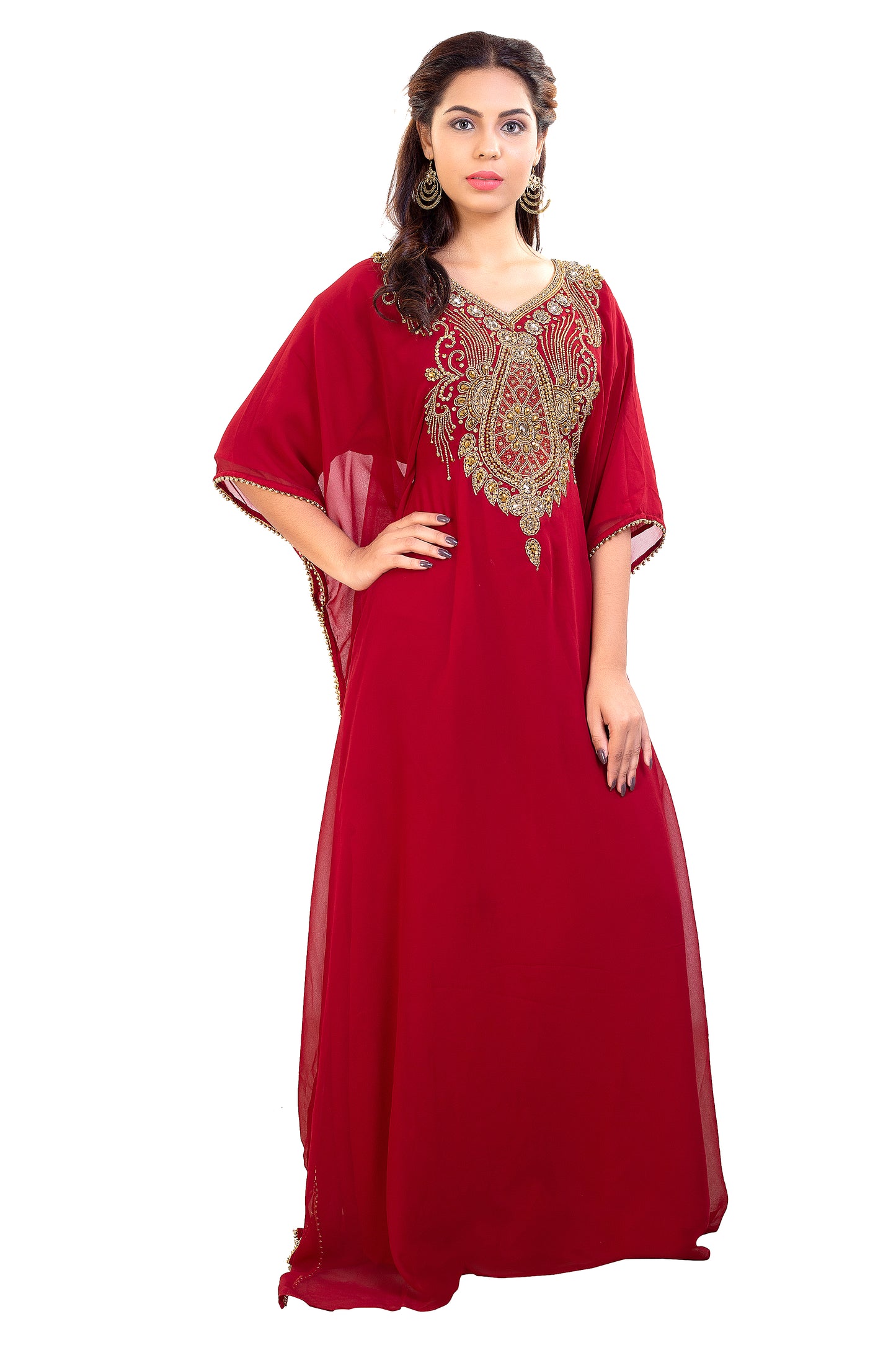 Dazzling and stylish dress, is adorned with golden beads, crystals, and sequins that are stitched with hand, and studded by fine specialist employee to correspond to the prosperity of cultural tradition. This eye-catching kaftan dress is astonishingly hand embroidery with high class fabric and exhibit good-looking drapes with elegance and flares that will increase your charm and improve your attractiveness. This maroon color dress comes in a 1 piece set with half sleeve and interior lining. |