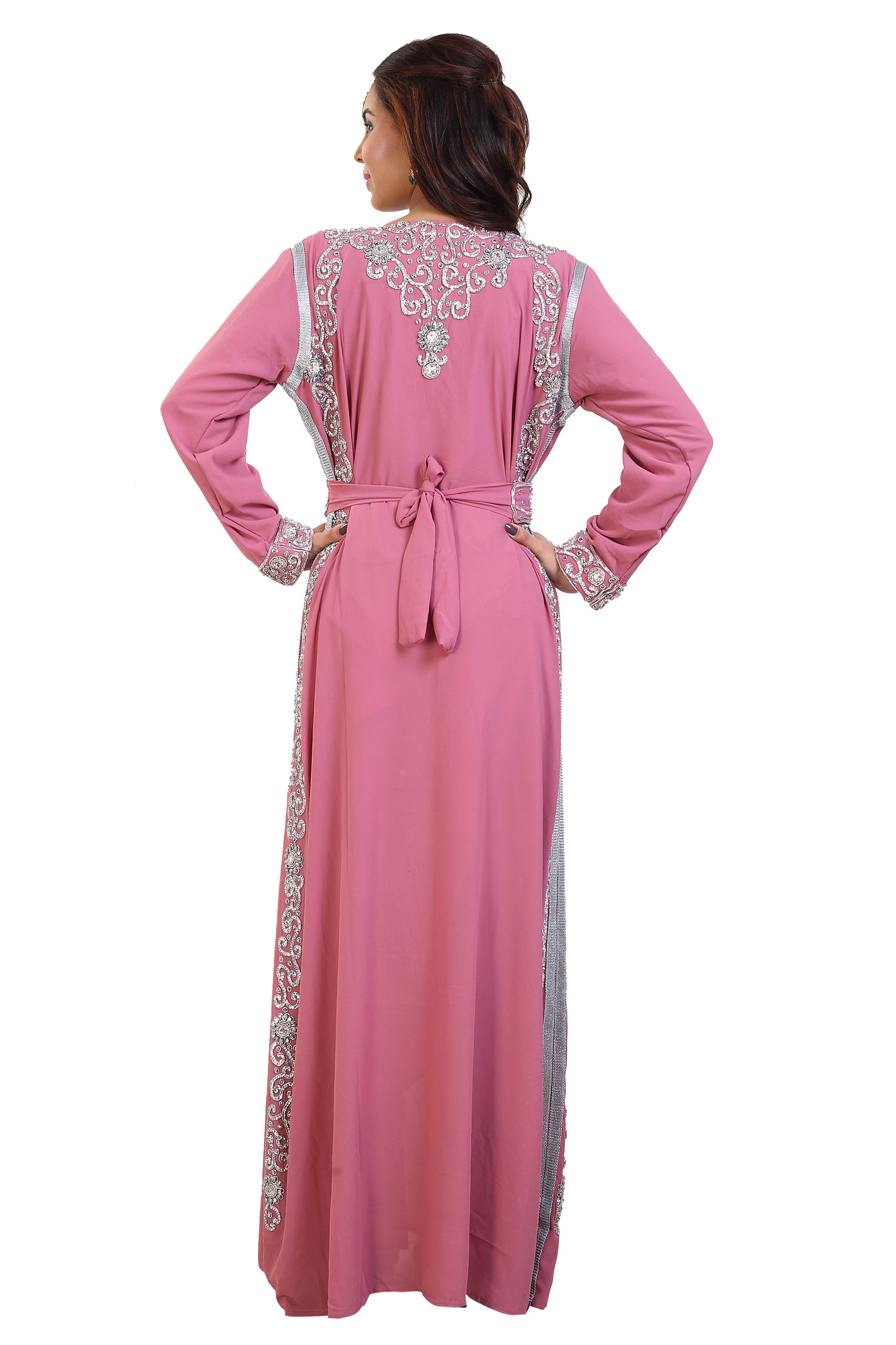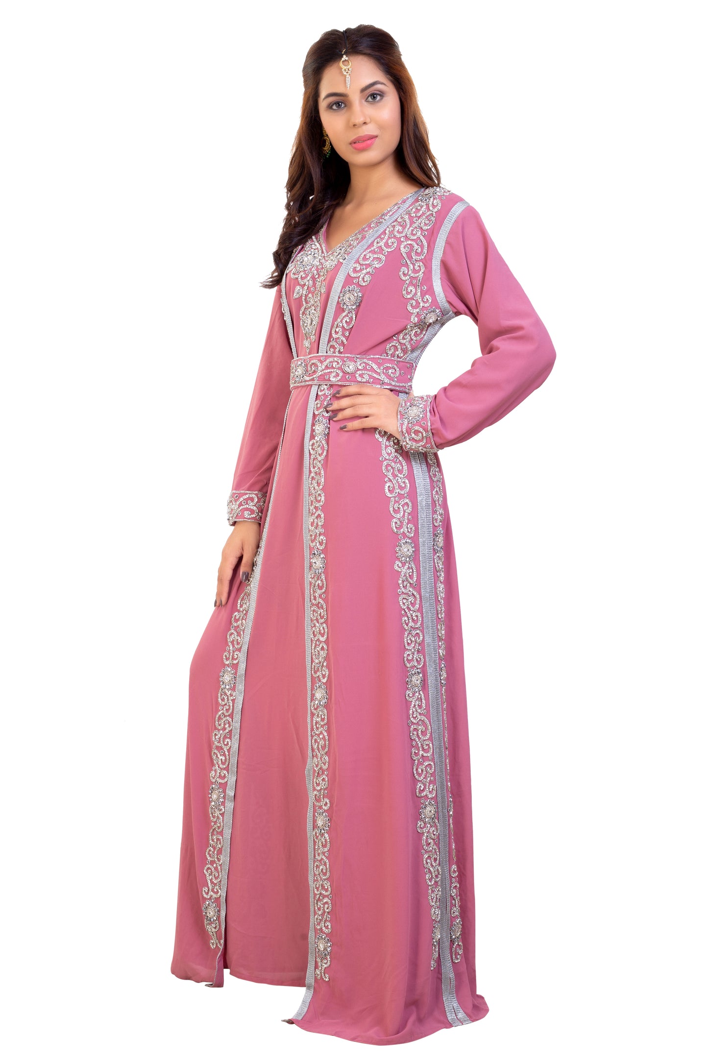 You can avail this offered collection of cape wedding dress from maxim creation. This piece is crafted with the finest georgette fabric quality. It has an attractive printed color that enables you to look drop dead pretty. This 3 piece set consists of hand embroidered silver colors of sequins and beads. You will get a free belt when you order for this pink full sleeve kaftan dress. |