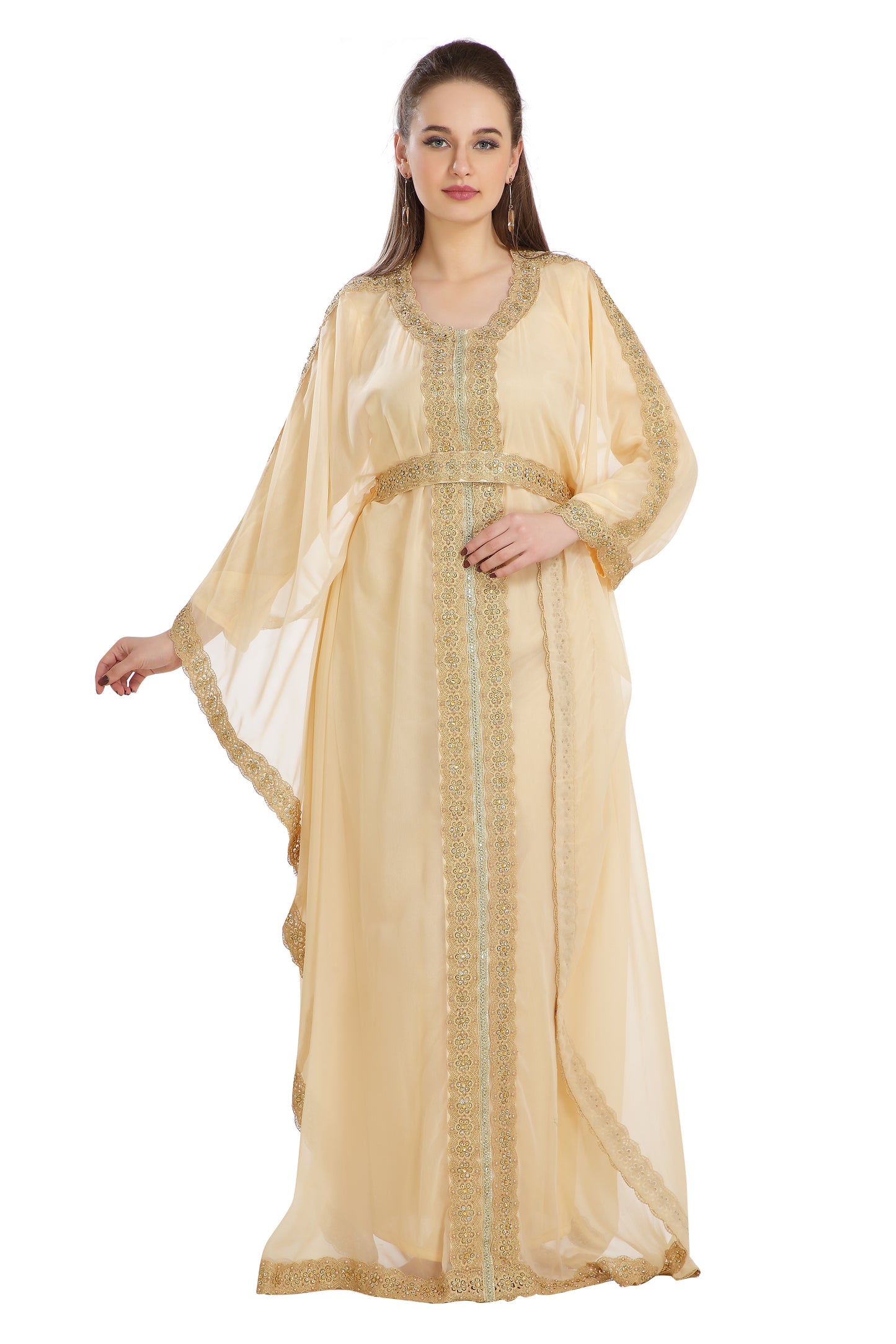 This Attractive Pleasing-To-The-Eye Attire Is The Ultimate Dress For All Occasion, With The Unique Golden Color Sequins And Beads. The Golden Hand Embroidery Outfit Remains The Best In The Stylish Kaftan Production Sector. The Beige Coloration, As Well As Georgette Kaftan Maxim Creation’s Innovation Is Irresistibly New And Ought To Be Ordered As A 2 Piece Set, ¾ Sleeve Kaftan . This Dress Has Inside Lining To Give The User Enough Comfy. You Can’t Afford To Miss This Georgette Kaftan Fabric Dress. |