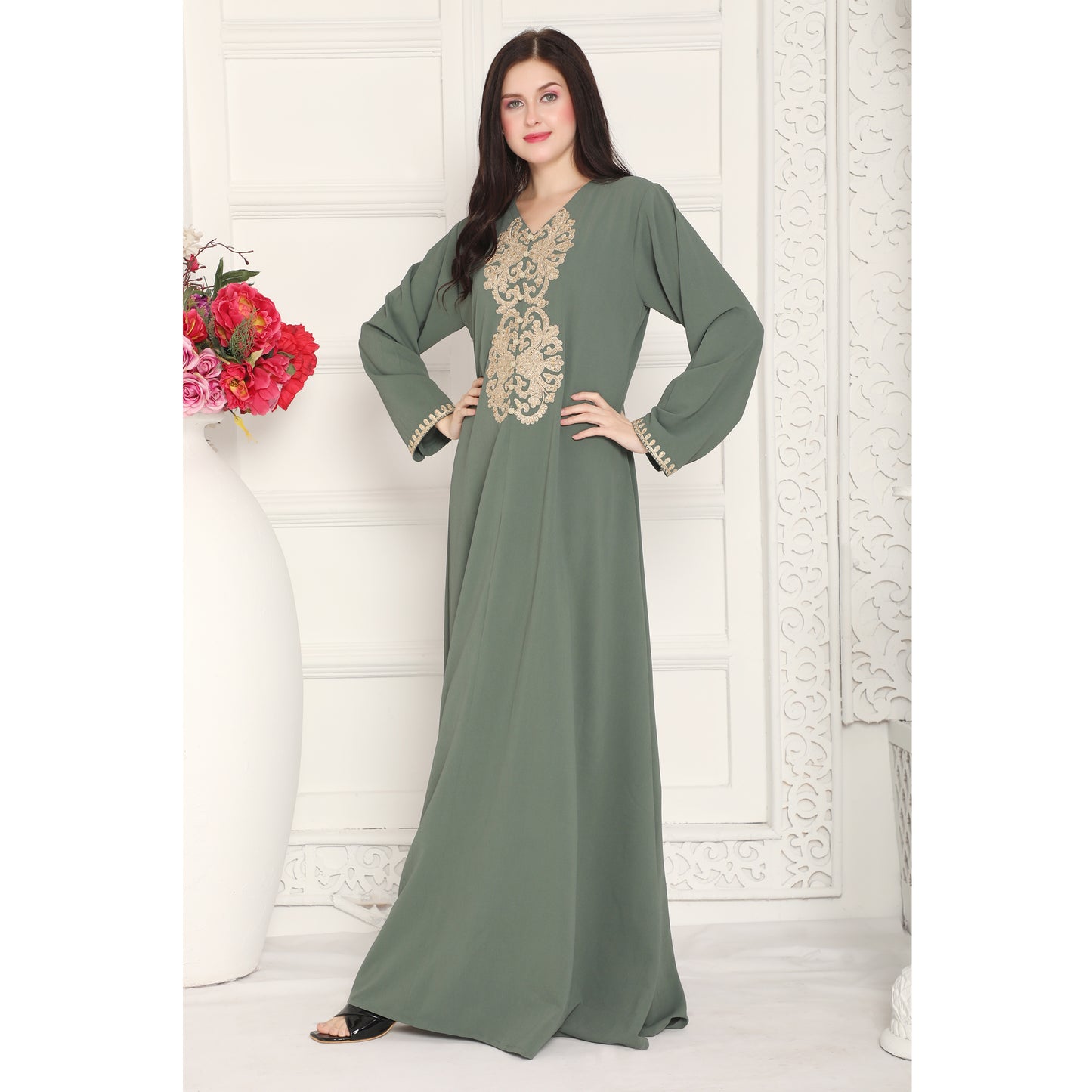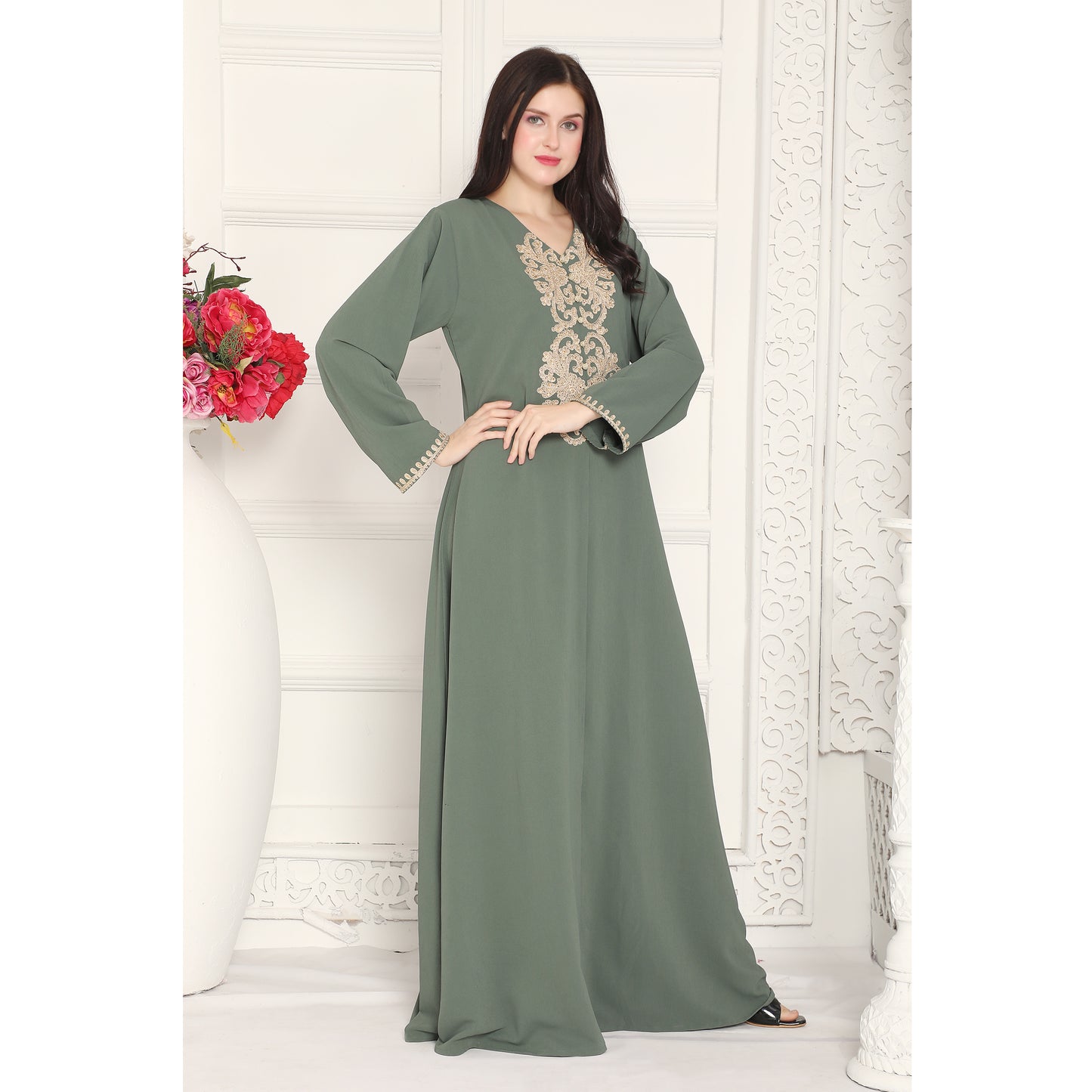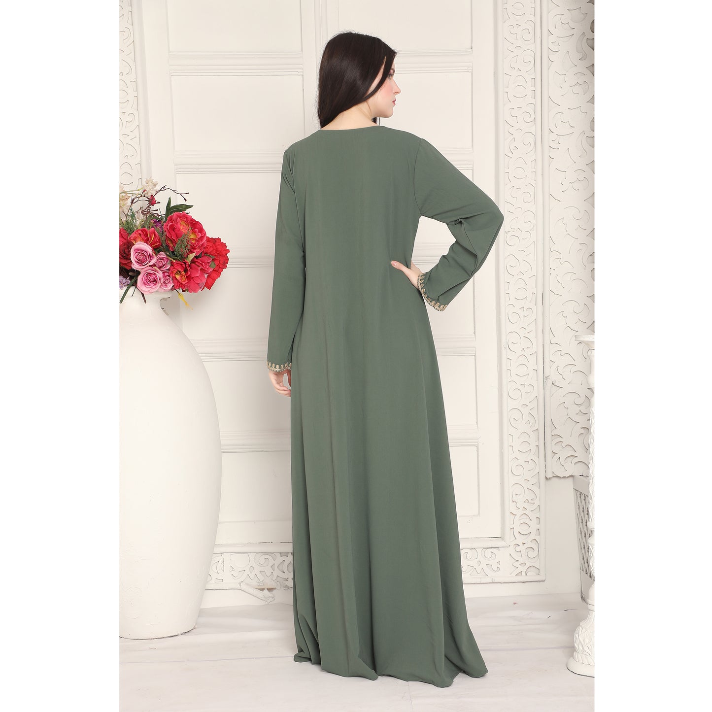 Green Textured Aari Embroidy Arabic Style Kaftan Farasha |