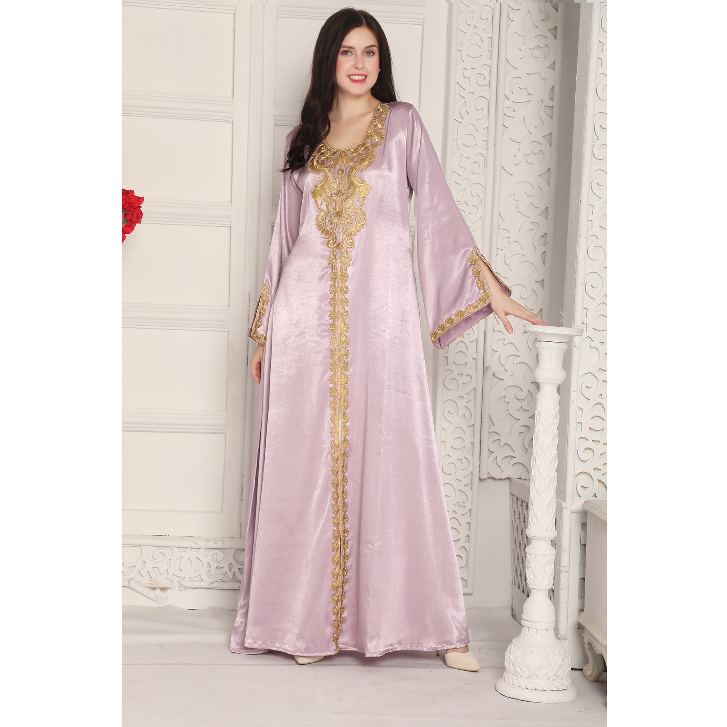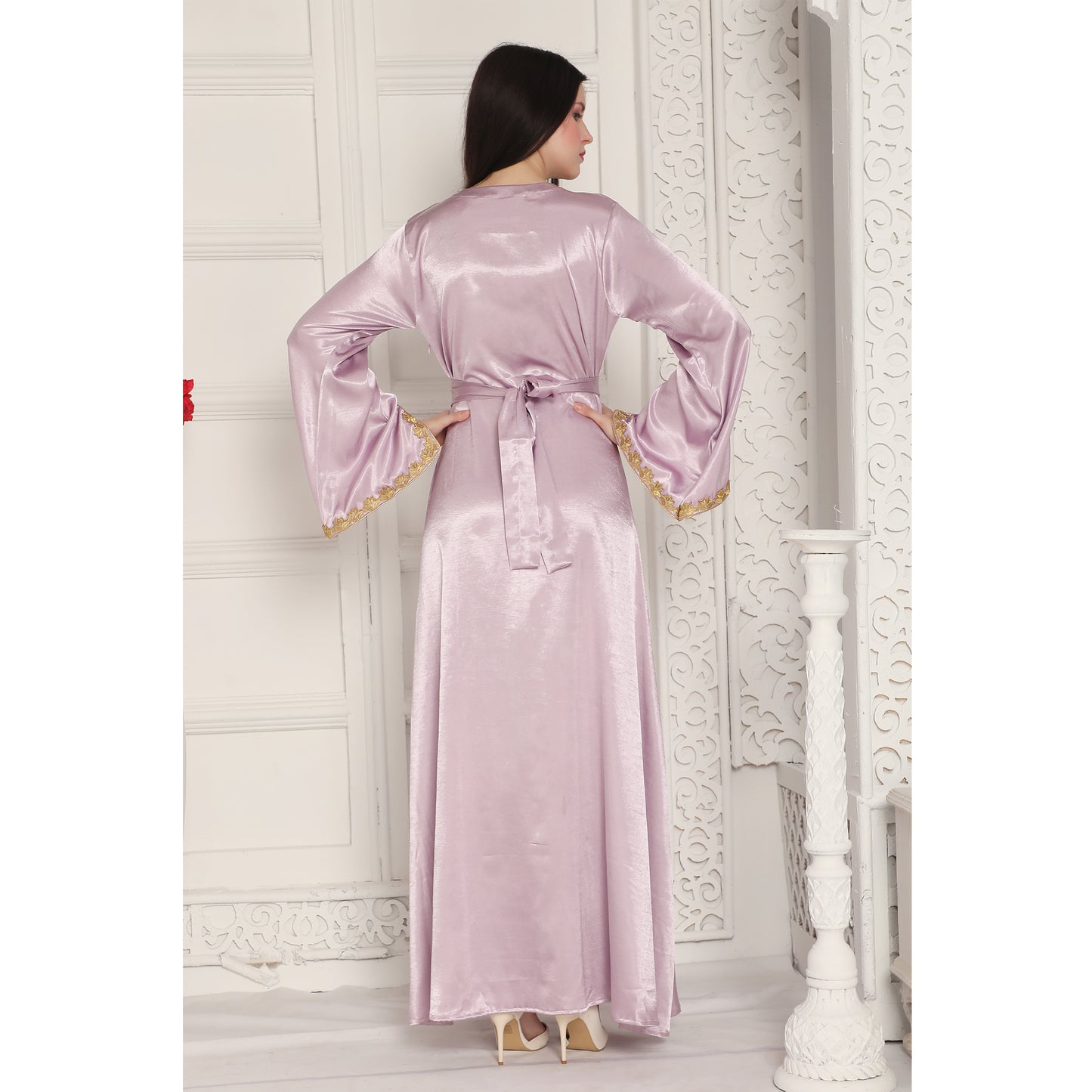 Gold Threadwork Embroidery Arabic Kaftan Farasha in Lilac Pink |