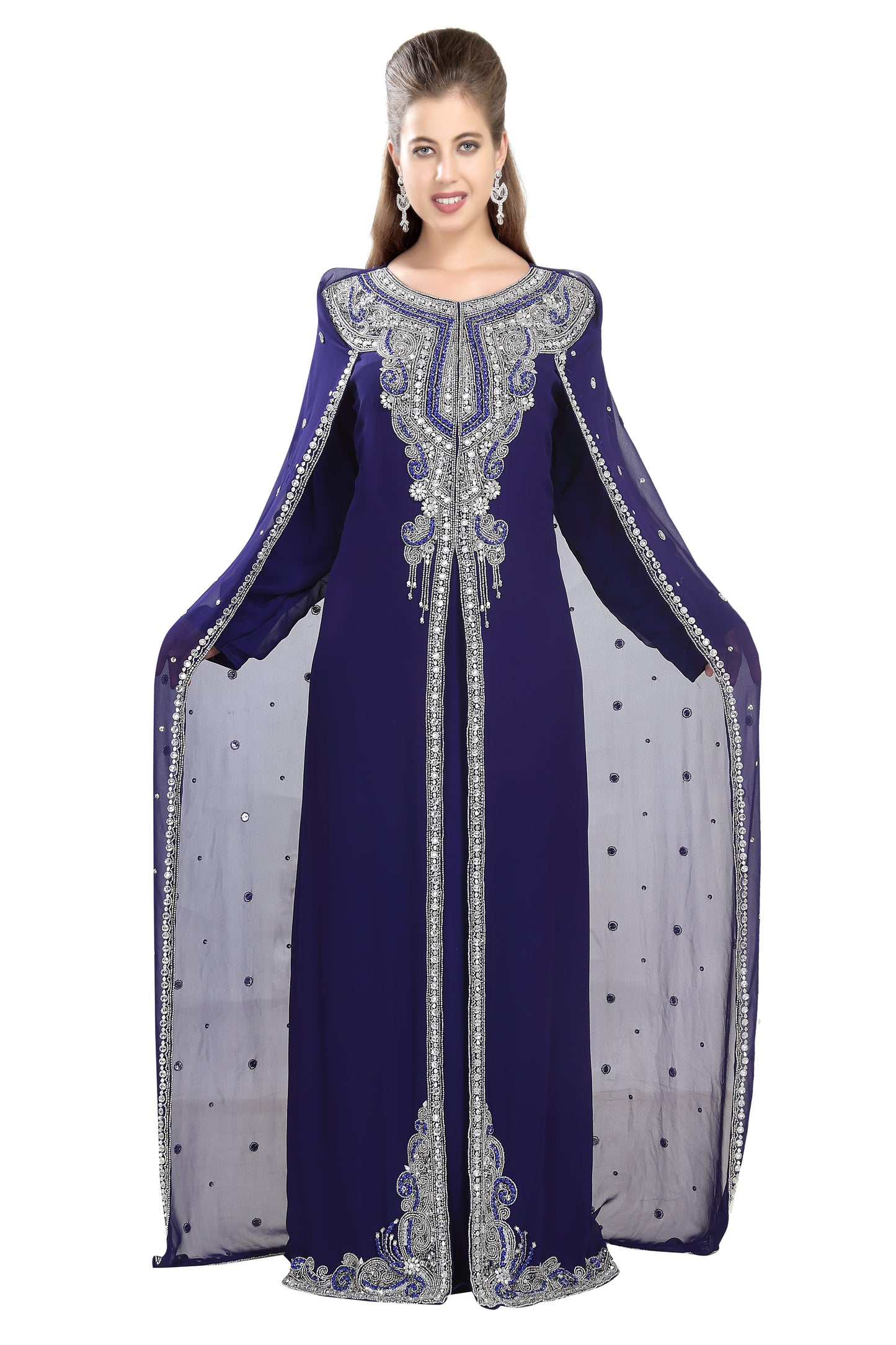This attention-grabbing elegant kaftan is just right for any event, with the royal blue and silver colour sequins and beads. This hand embroidery attire remains on top in the well-groomed kaftan industry. This navy blue georgette kaftan is a novel maxim creation craft and would be made to order. When it comes to fitness, the XS Size can fit you if you are slim. So, ladies grab your superman look 1 piece set and get a free belt to team up with this full sleeves attire. |