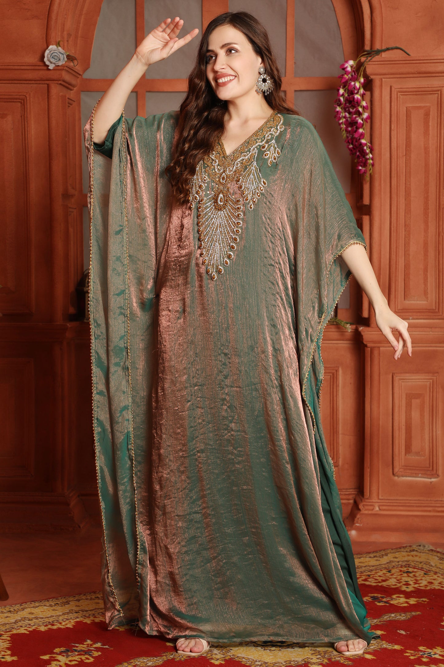 Light Brown Kaftan with Beaded V-Neck and Intricate Gold Embroidery |