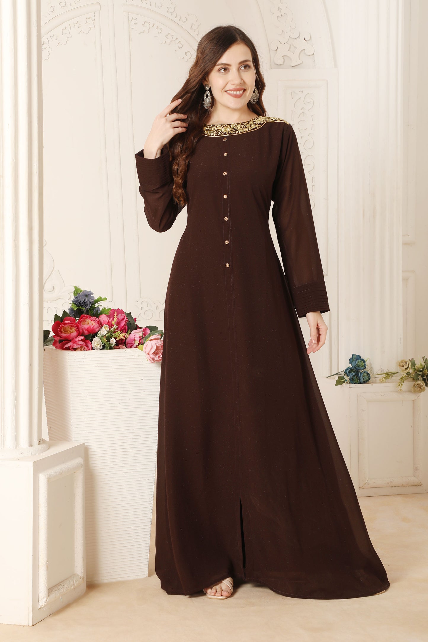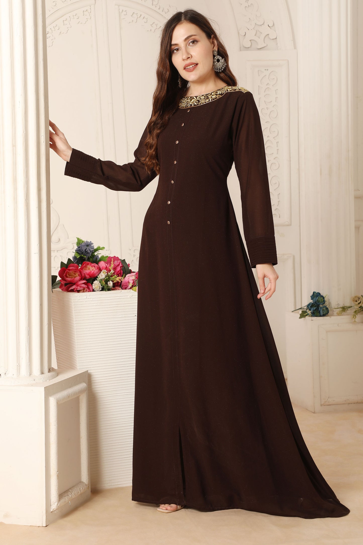 Brown Round-Neck Jalabiya with Pleated Cuffs |