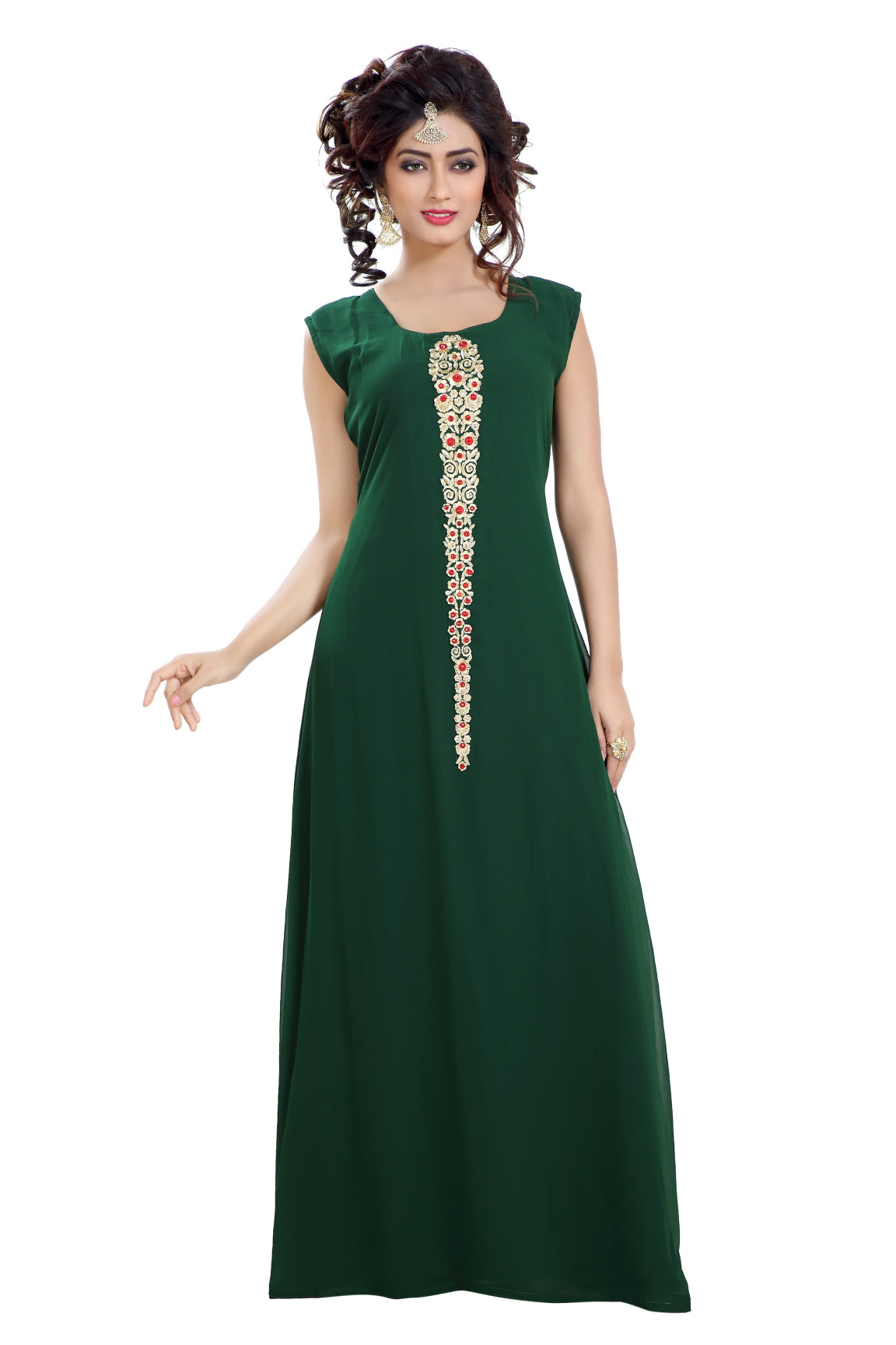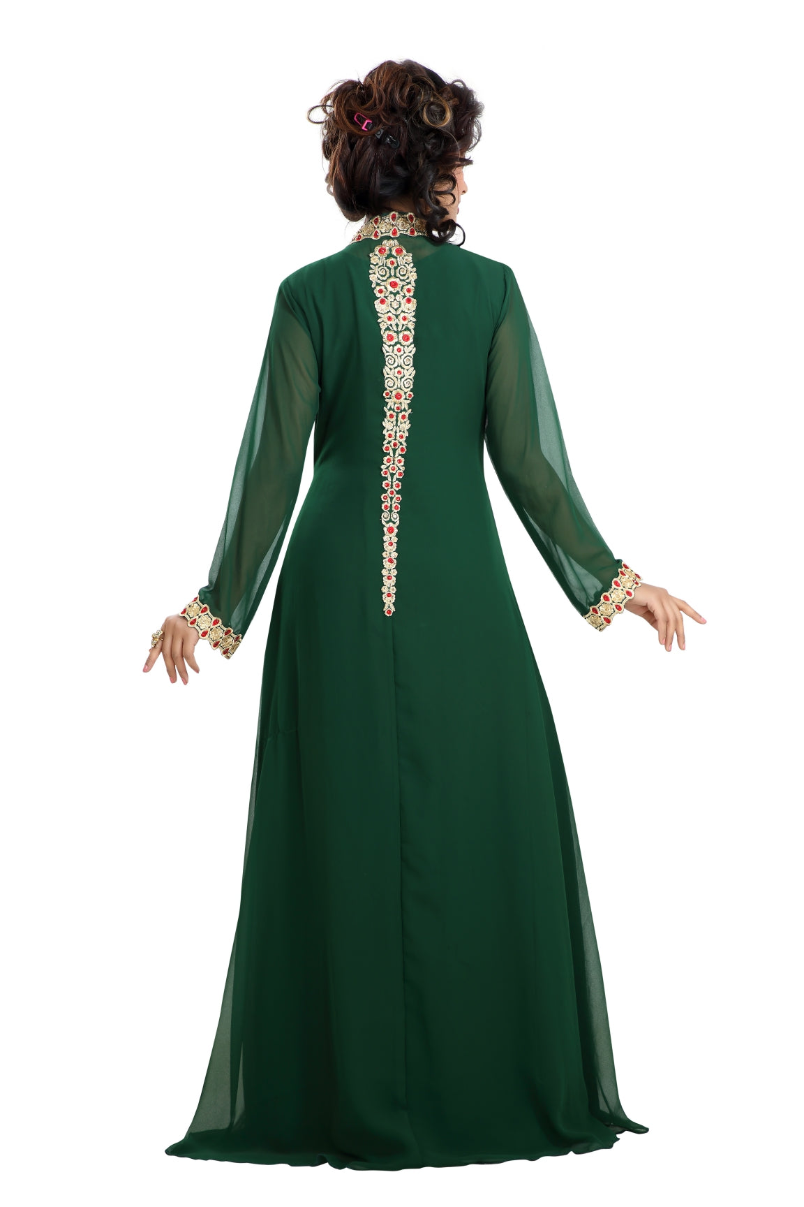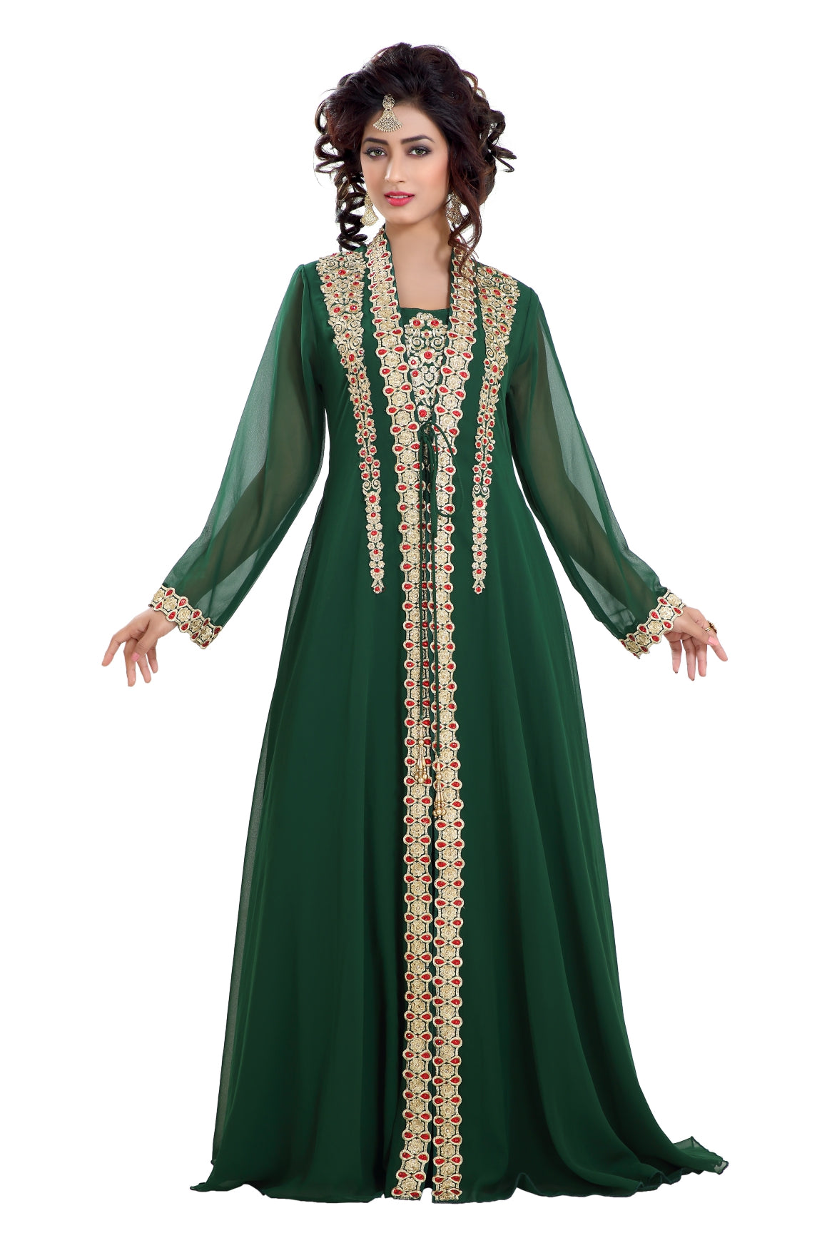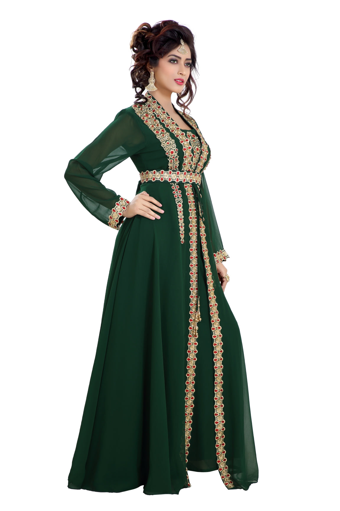This golden colour beads and sequins ari work machine embroidery with hand touch will glitter up your occasion. This bottle green colour georgette fabric kaftan dress is 3 piece set (with belt) & full sleeve dress (this dress is lined from the inside). Try a new appearance every day to enhance your look! This stunning georgette fabric walima gown helps you appear to drop dead beautiful in the shade of bottle green. This piece with golden color sequins and beads machine embroidery would spruce up your event |
