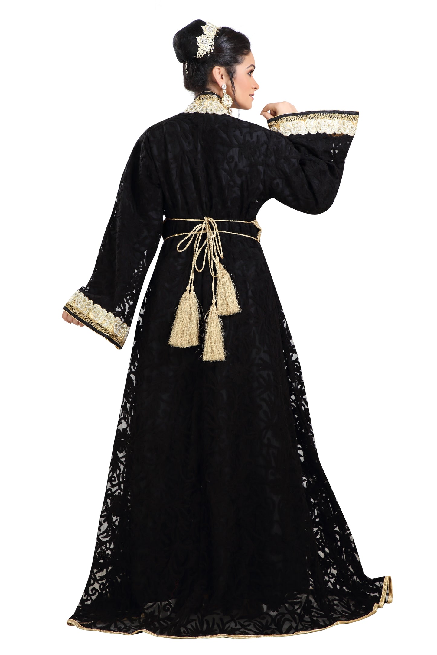 This mix colour beads and sequins hand embroidery with hand touch will glitter up your occasion. This black colour jacket -embroidered georgette & inner satin fabric kaftan dress is 3 piece set (with belt) & full sleeve dress (This dress is lined from the inside). Mix color sequins, beads, and hand stitching for a wedding or bridal occasions is classy and suits well into every wardrobe. The designs on this beautiful piece can brighten your occasion with grace and attraction. |