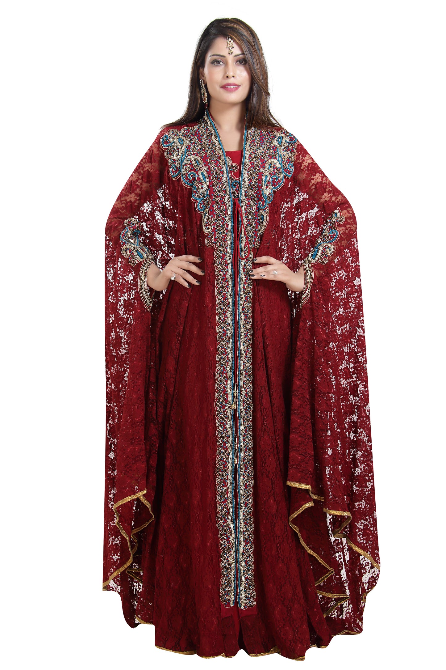 Incredible, eye-catching and stylish dress, bejeweled with multi-colored beads, sequins that are stitched with hand by fine expert workers is a must-have item for your closet this season. This eye-catching caftan dress is astonishingly hand embroidered with high class lace fabric exhibits pretty drapes with stylishness and flares that will enhance your charm and improve your pleasant appearance. This oxi-blood color costume comes in 3 piece set with full sleeves & an interior lining with a belt absolutely free. |