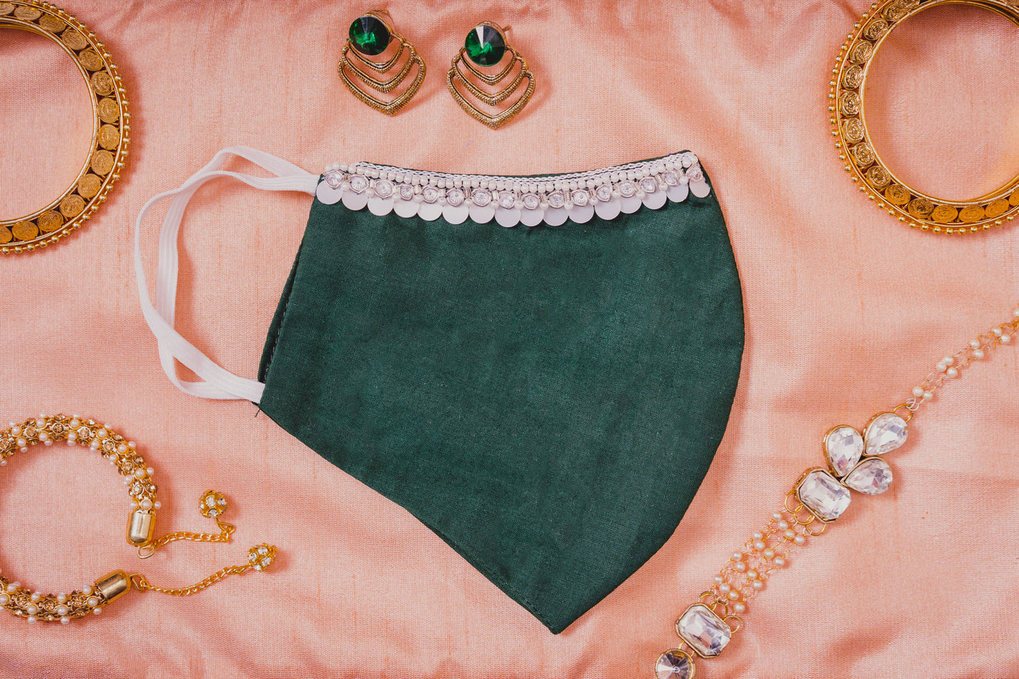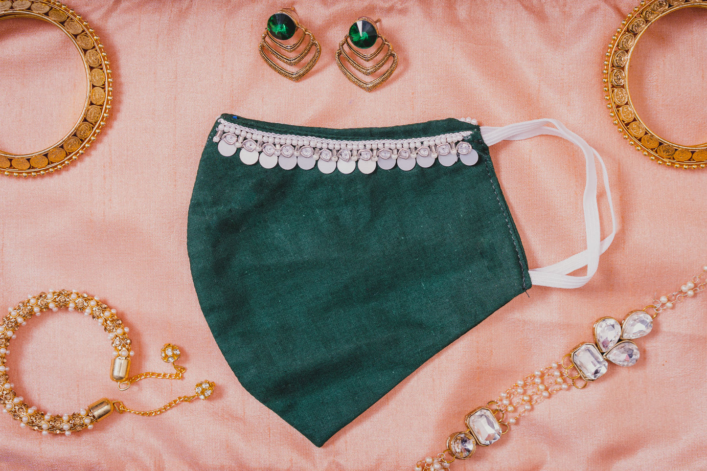 Bottle Green Coloured Cotton Face Mask with Hanging Tassel Embroidery |
