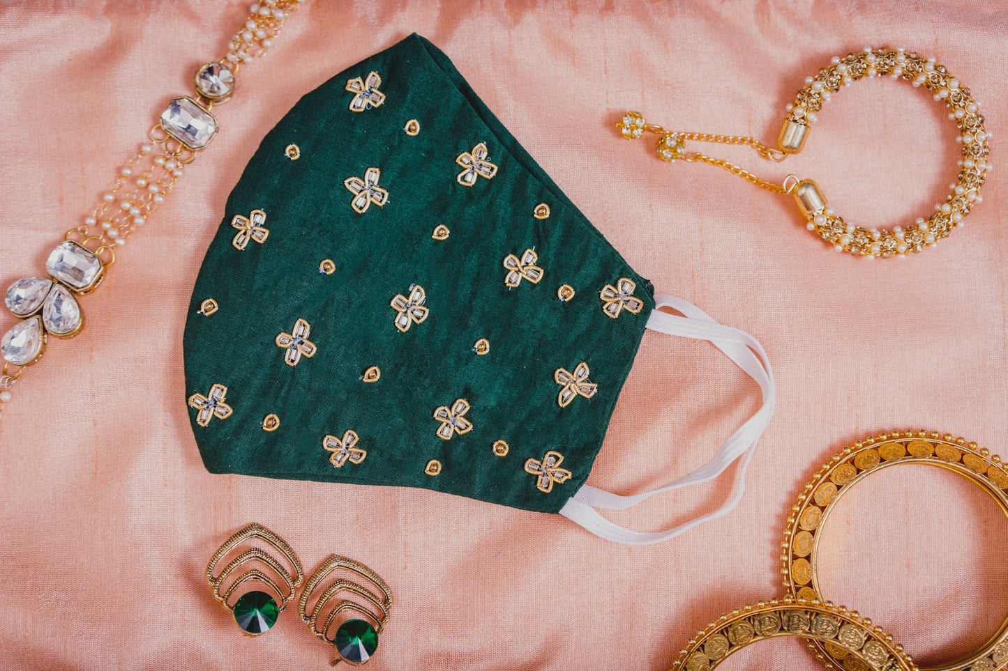 Emerald Green Cotton Face Mask with Floral Embroidery |