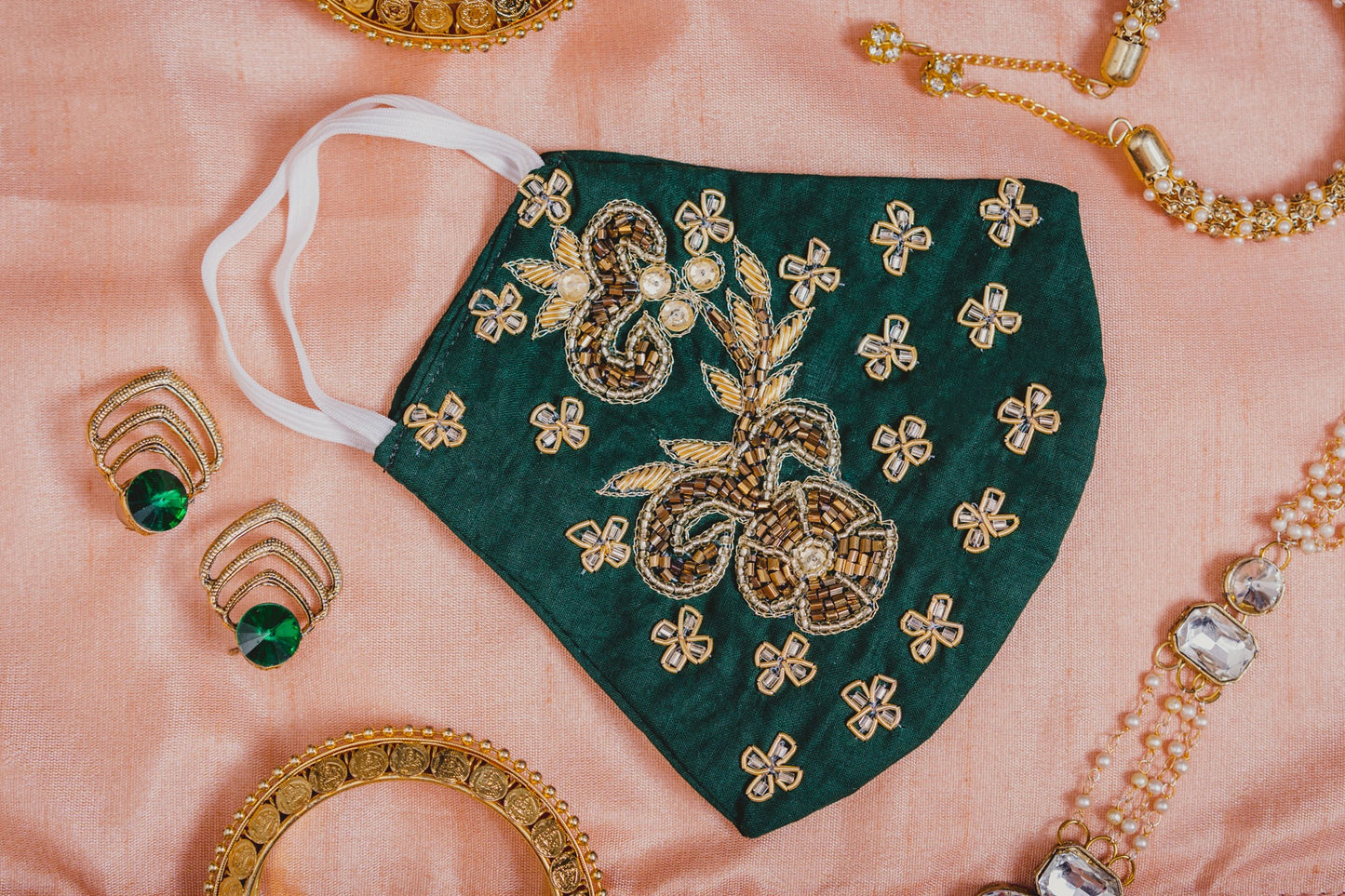 This is a Green coloured cotton face mask with golden Floral Embroidered Beads. Crafted by our designer specialists, this mask can be used at your special occasion. Maxim Creation keeps safety as a first priority with unique and fashionably hand crafted designs. This timeless and luxurious piece face mask is perfect for family functions and parties or wedding occasion and casual wear. |