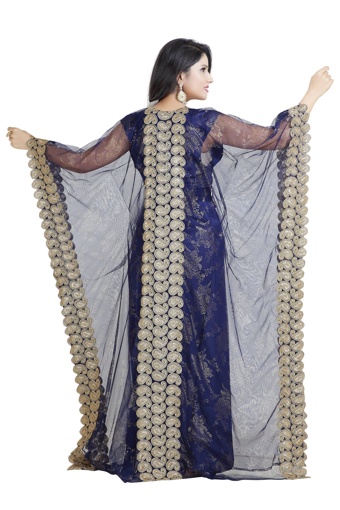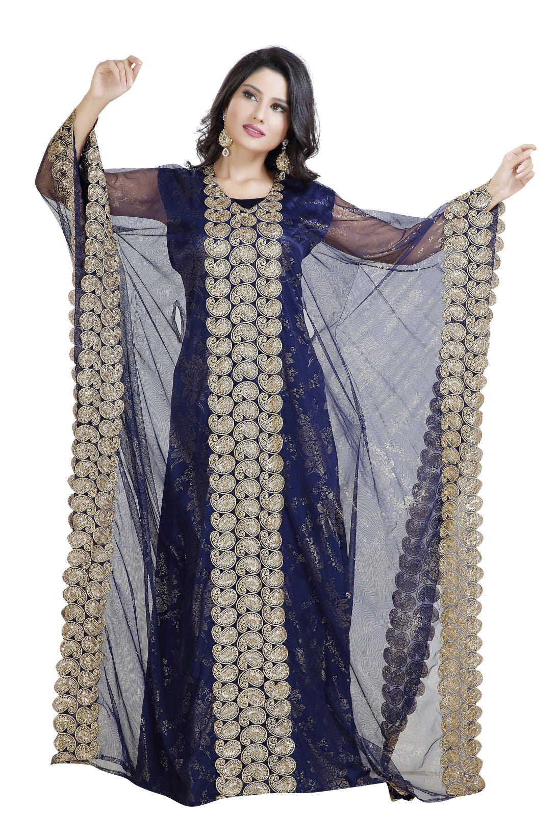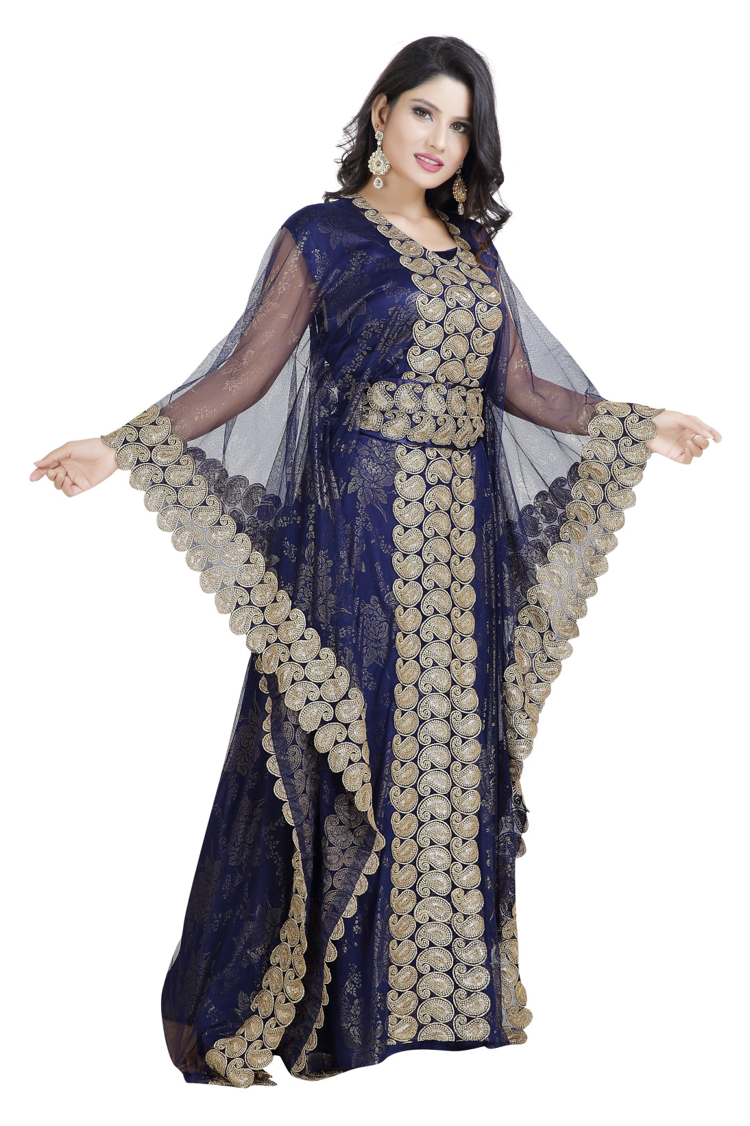 This golden colour beads and sequins ari work machine embroidery will glitter up your occasion. This navy blue colour net fabric kaftan dress is 3 piece set (with belt) & 3/4 sleeve dress (This Dress Is Lined from the Inside). This marvelous traditional algerian navy blue jabodar from maxim creation is made of net, tangled with ari machine embroidery with hand touch sequins and beads. The sleeves are in kaftan style, with full-length lightweight and loose fit. This jabodar is perfect as a splendid cover-up for your attire, or for your next kaftan performance. |