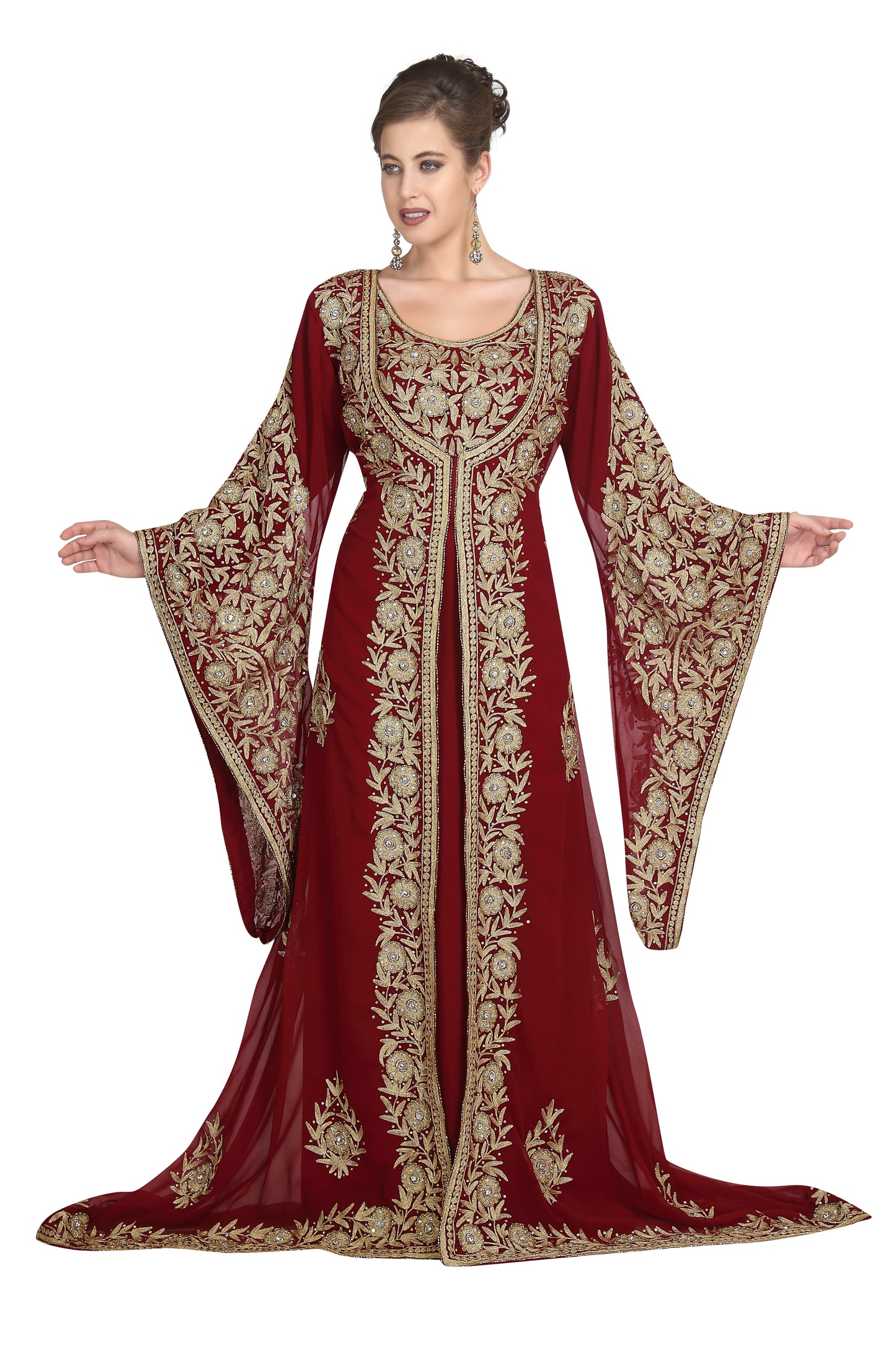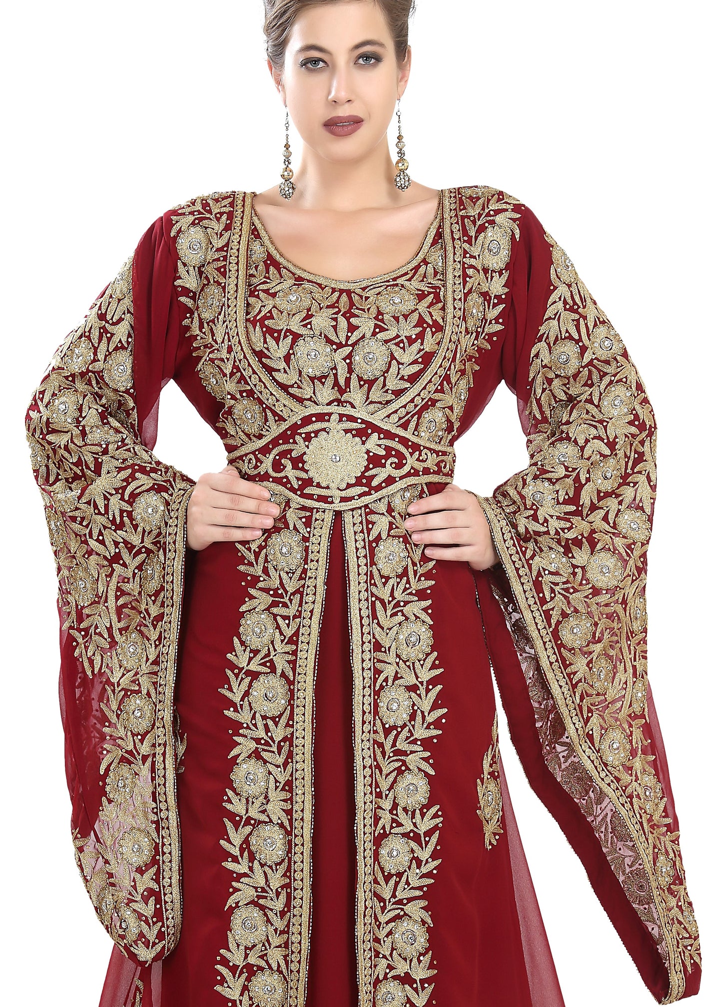 This golden colour beads and sequins ari work machine embroidery will glitter up your occasion. This maroon colored georgette fabric kaftan dress is 3 piece set (with belt) & full sleeve dress (This Dress Is Lined from the Inside). Eye-catching stylish kaftan from Maxim Creation is ideal for any time and any season. Have all eyes on with the golden color sequins and beads. Machine embroidery outfit stays in front when rating this trendy kaftan. |