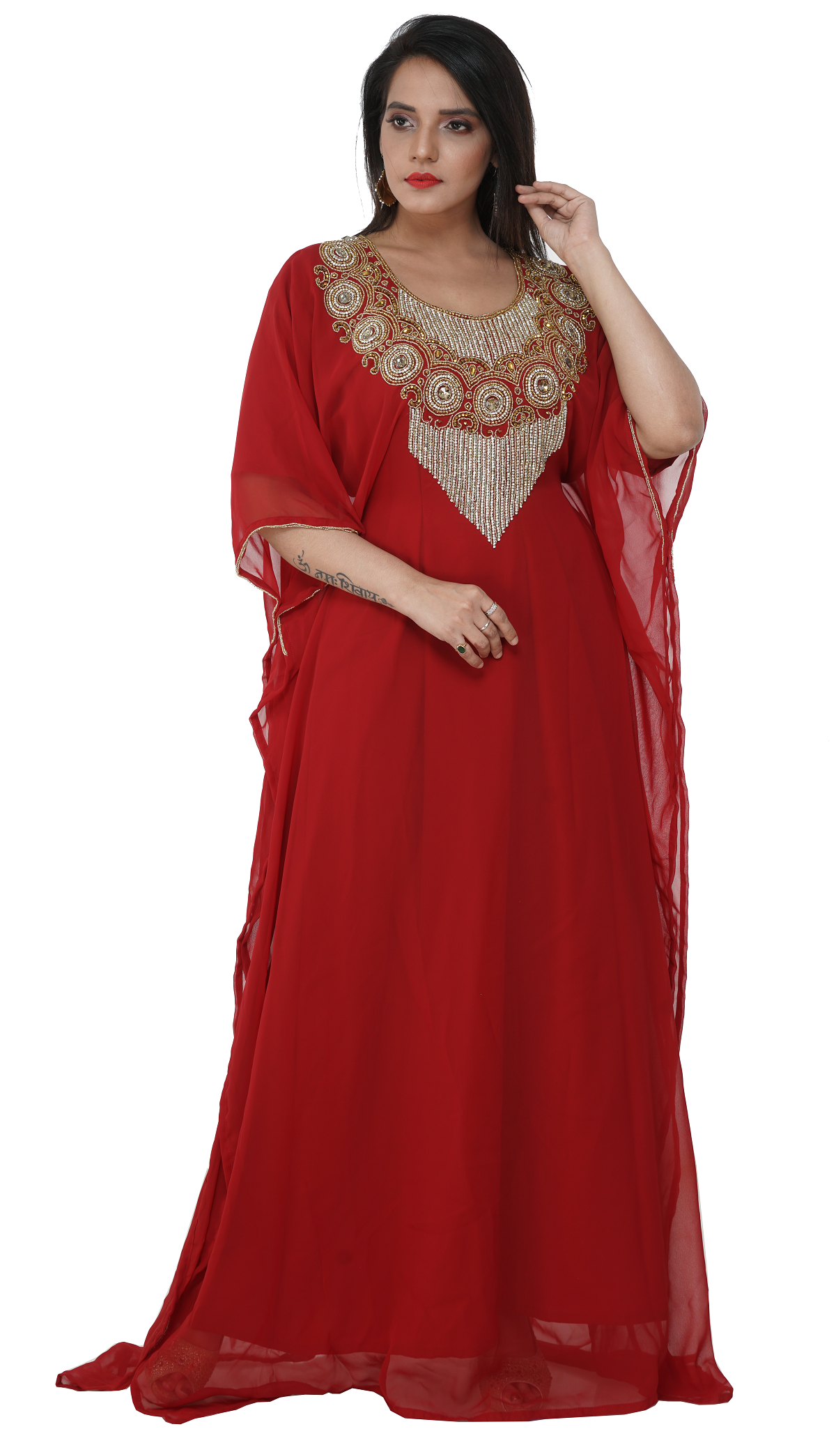 Accentuate your look by wearing this dress from maxim creation. This red color georgette fabric dubai kaftan has scoop neck design. Specially crafted by our in-house designer which have golden and silver embroidery. Good for special moment with family and friends. This box contains a 1 pieces of set. |