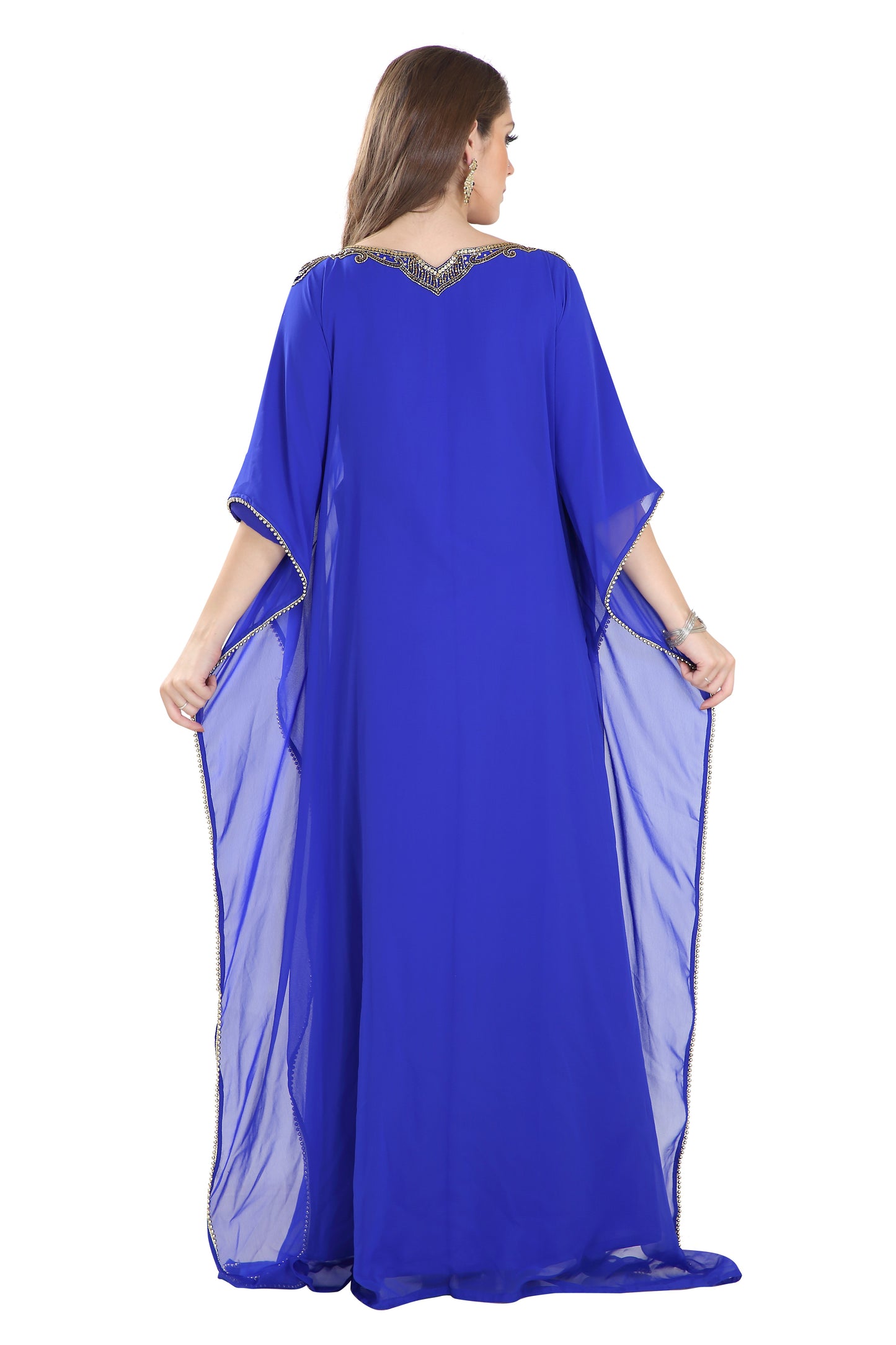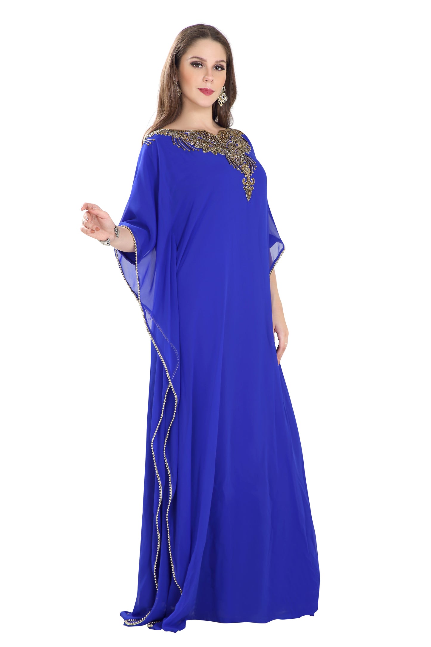 Fresh and sparkling! This long maxi gown will keep you fresh throughout your event. It is designed with a very cool and light weighted georgette fabric and also has a soft inner lining. This kaftan is hand embroidered with mix colour beads. Brought to you by maxim creation, this stunning piece is versatile and easy to wash and wear. This dress is 1 piece set & half sleeve dress. |