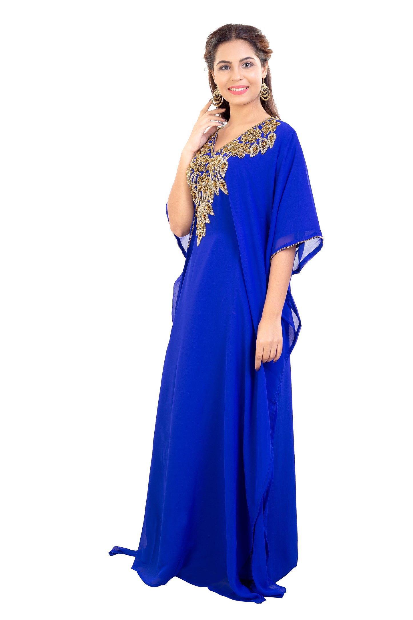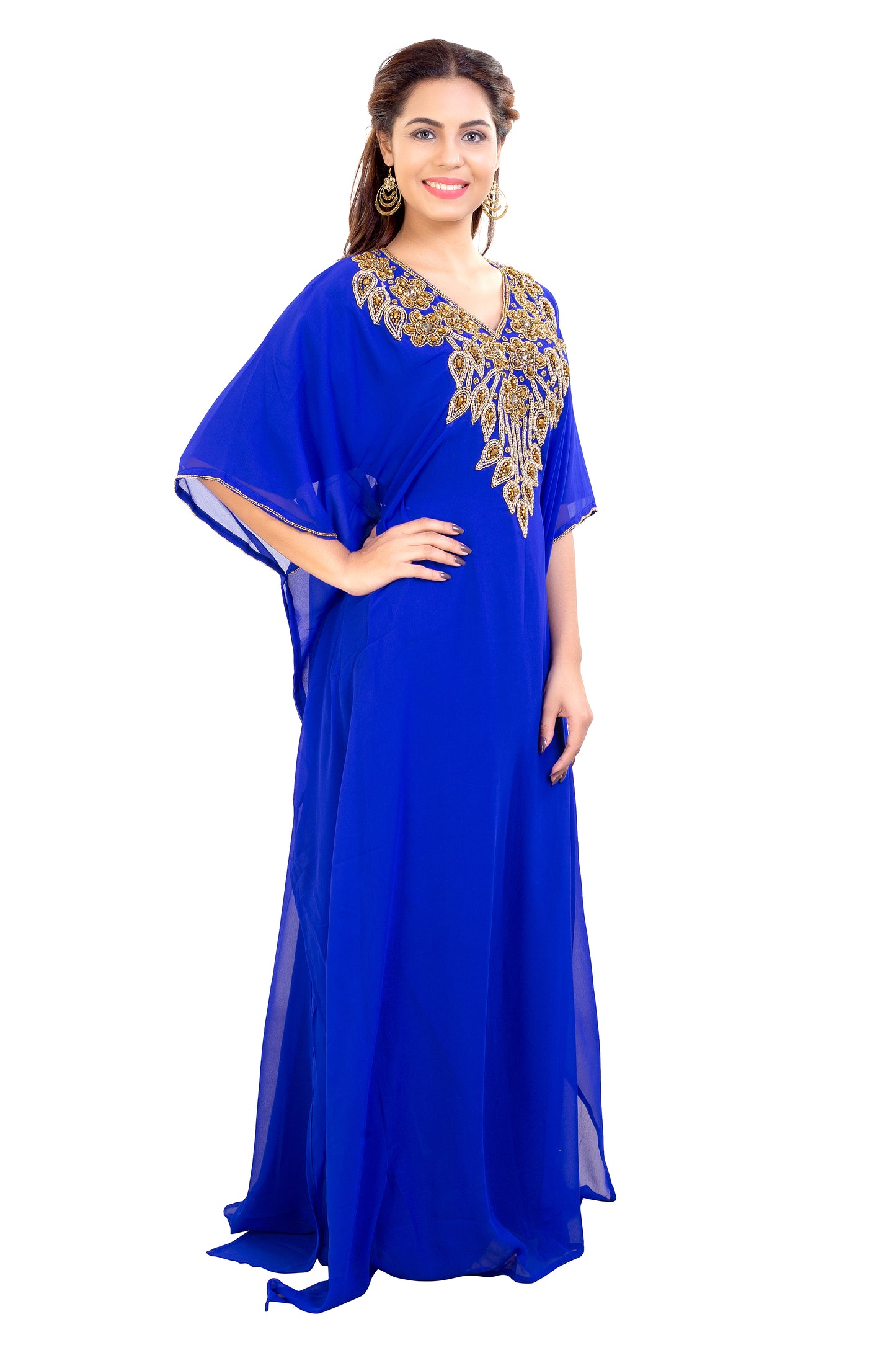 Whether you like to glue to fashionable styles or experiment with bold, contemporary designs for a fusion look, maxim creation farasha compilation has everything and more. This royal blue maxi kaftan is designed with mix colour sequins and beads to highlight your beauty on your occasion. It is wonderfully hand embroidered with high-class georgette fabric, and shows beautiful drapes with volume, finesse and flare. A 1 piece set + half sleeve dress + inner lining is what we offer for your comfort and stunning looks. |