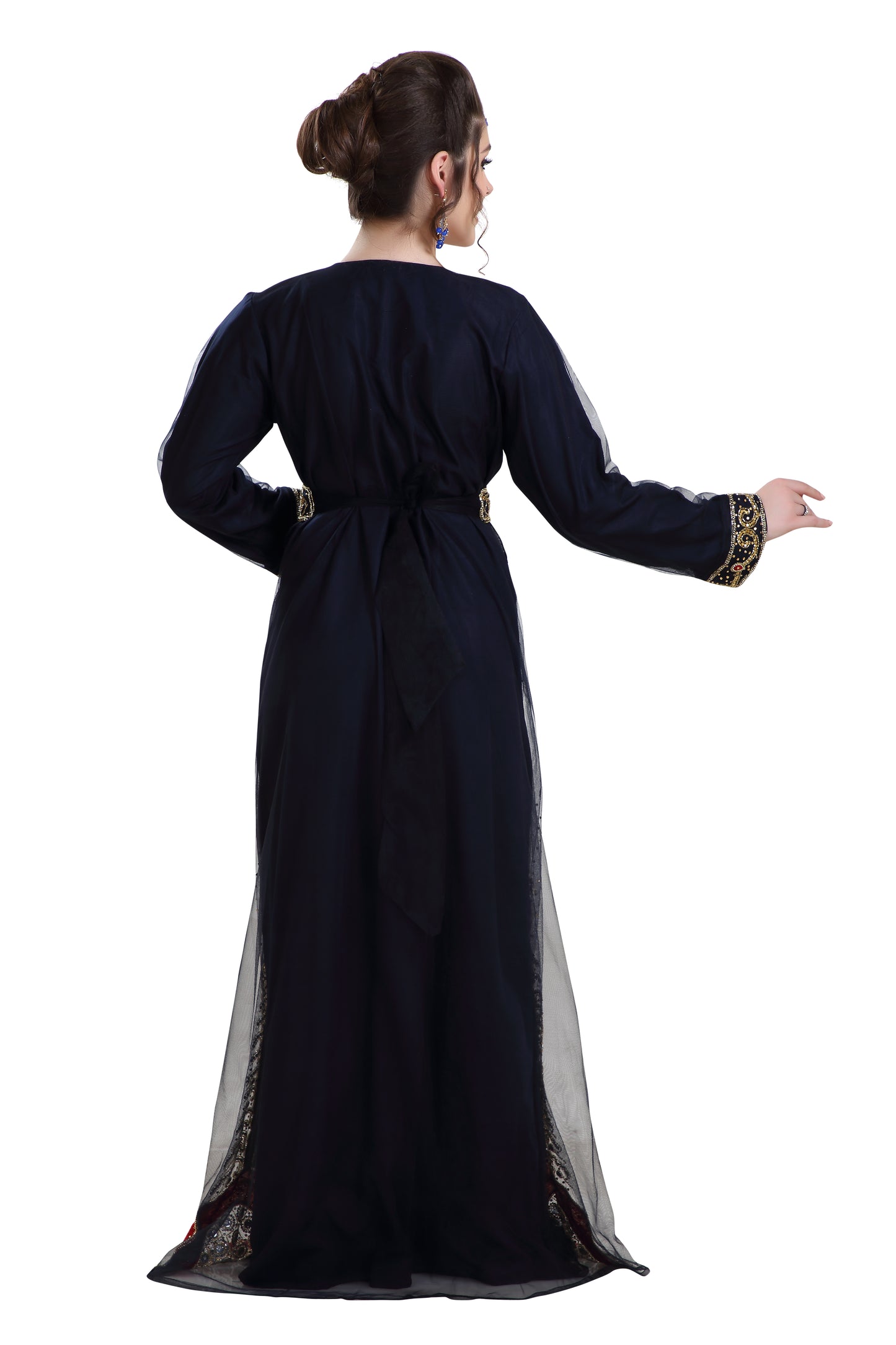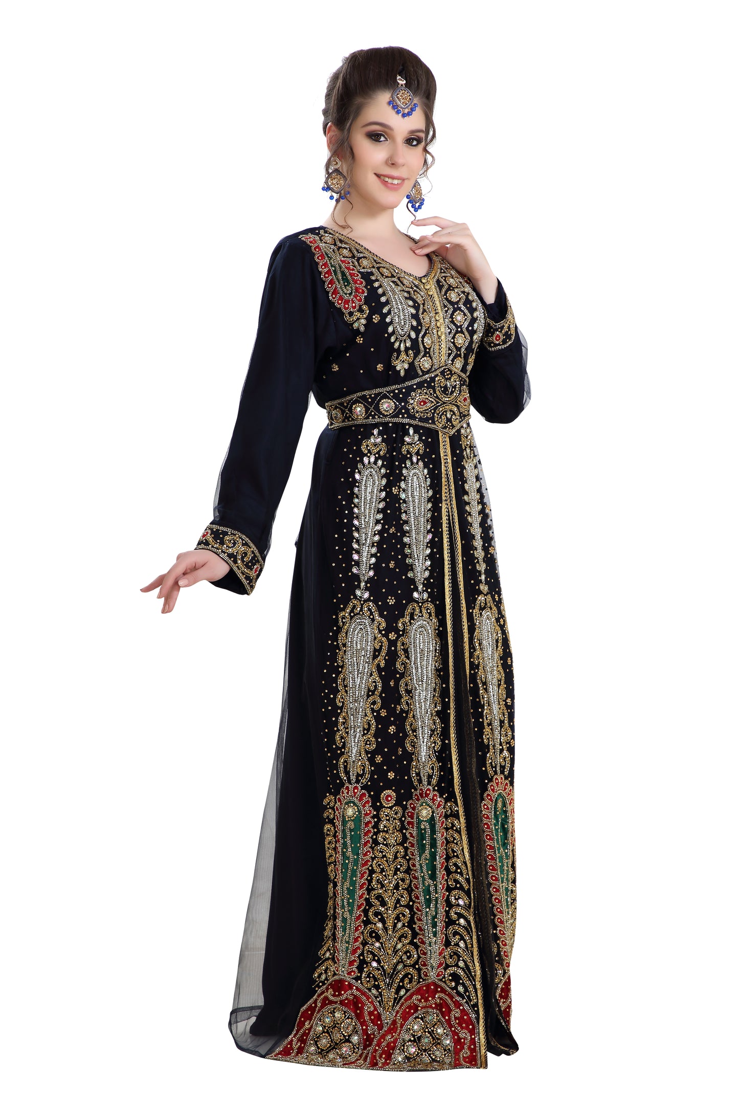 This dress comes with a Mix Variety of Embroidered Beads and Sequins to give you a stylish look. Featuring Full Sleeves this Takchita is a V – Neck design. Crafted by one our expert designers that is perfect for your wedding occasion and to add that perfect outfit to complete your wardobe essentials. This Dress comes as a 2 piece set including with a belt. |