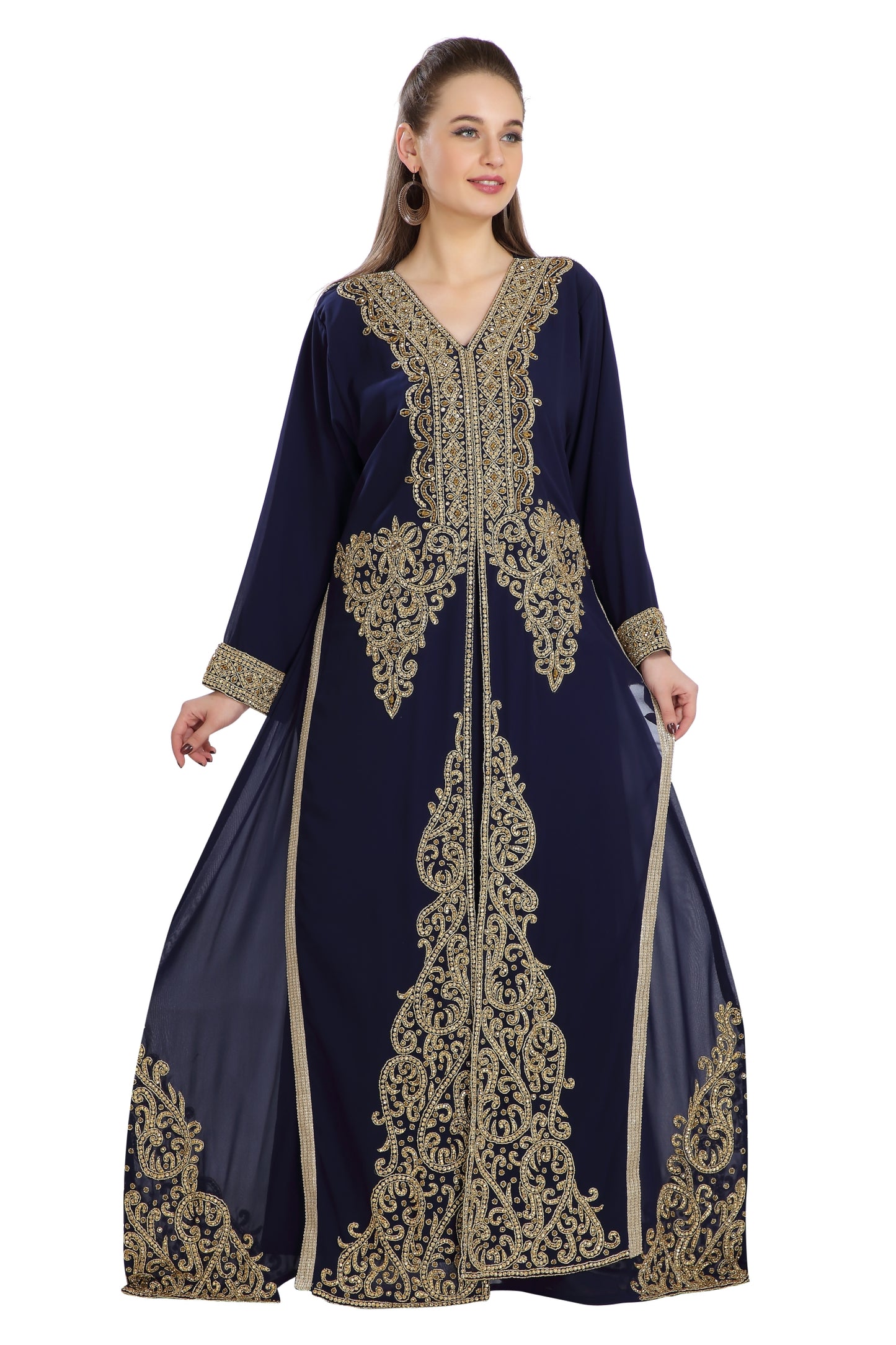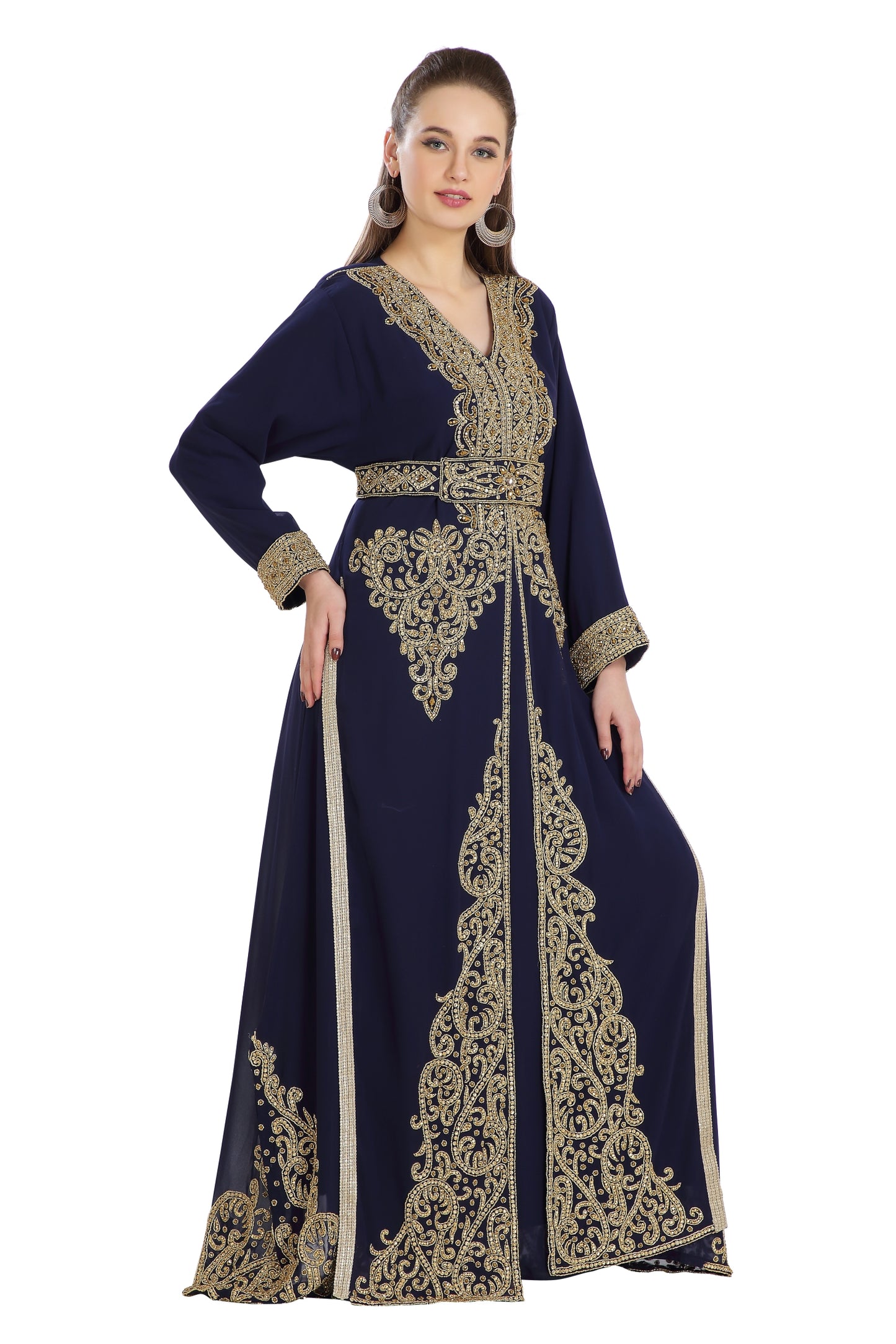 Filch the hearts away using this navy blue color golden hand embroidered georgette fabric bridal gown. This timeless and luxurious 2 piece kaftan dress is perfect for Eid or any function or wedding occasion capturing the heart and attention. The dress has long sleeves and is skillfully embellished with luxurious hand embroidery and golden color sequins with a slit at the front. The dress is finished with a beaded sash to give an extra touch of elegance. |