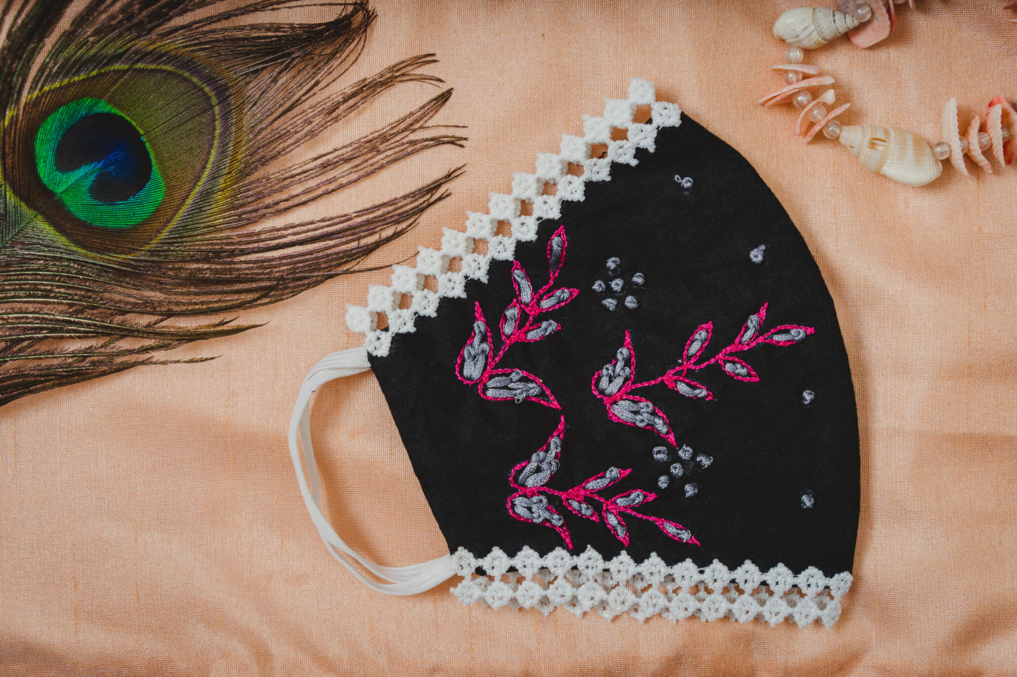Black Coloured Cotton Lace Face Mask with Floral Thread Embroidery |