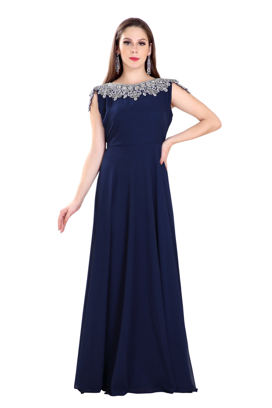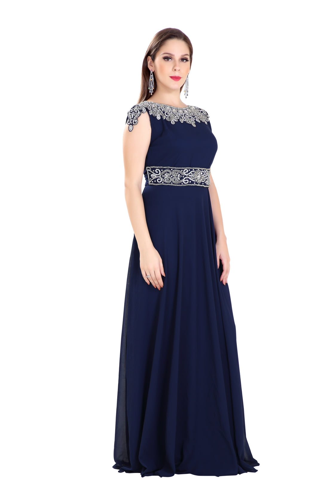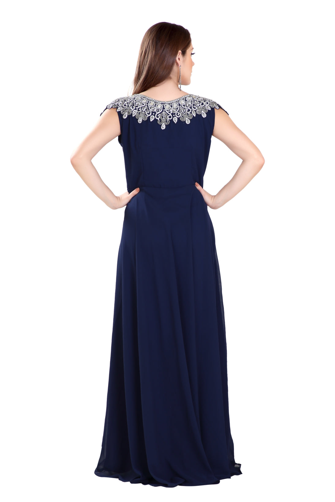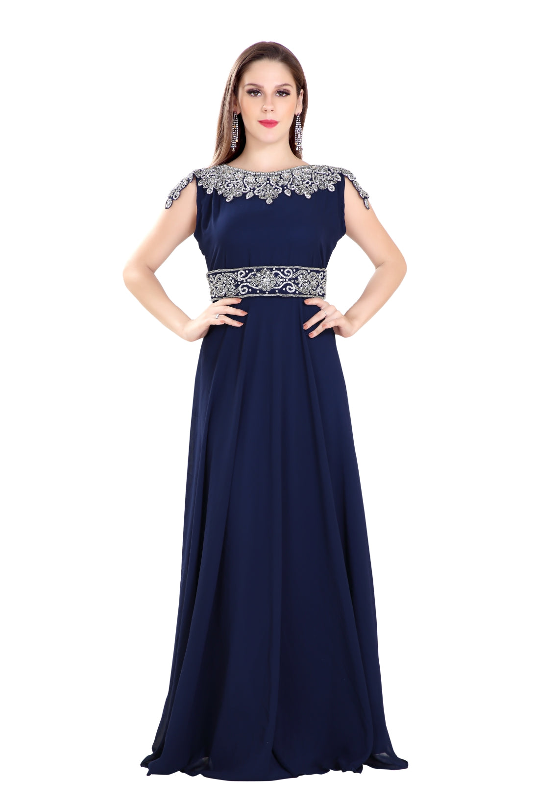 This silver colour beads and sequins hand embroidery will glitter up your occasion. This navy blue colour georgette fabric kaftan dress is 2 piece set (with belt) & sleeveless dress (This Dress Is Lined from the Inside). Make your wedding different and one in a million by wearing this long maxi kaftan from maxim creation. Add romantic moods with this charming and sophisticated wedding gown. |